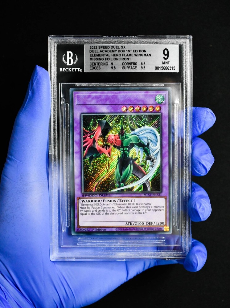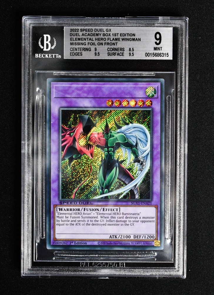 You are Bidding on Yugioh ELEMENTAL HERO FLAME WINGMAN No-Name No-Imprint SGX1-ENA21 Secret Rare Misprint card. *This card is Professionally Authenticated and Graded as MINT BGS 9 . *This is a must have to all who collect misprinted card - Beautiful Iconic Artwork with Secret Rare Foil *As you can see on the photo, there are some foil bleeding also adding to the nostalgia of the card *Misprinted and Error card are hard to come by, So don't miss your chance and Buy it Now...