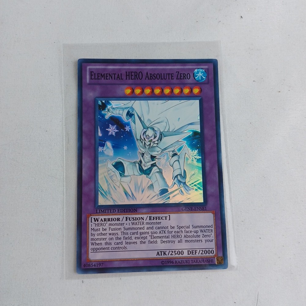Yugioh Elemental HERO Absolute Zero GENF-ENSE1 Super Rare Limited Edition NM. Condition is Ungraded. Shipped with USPS First Class Mail Letter.