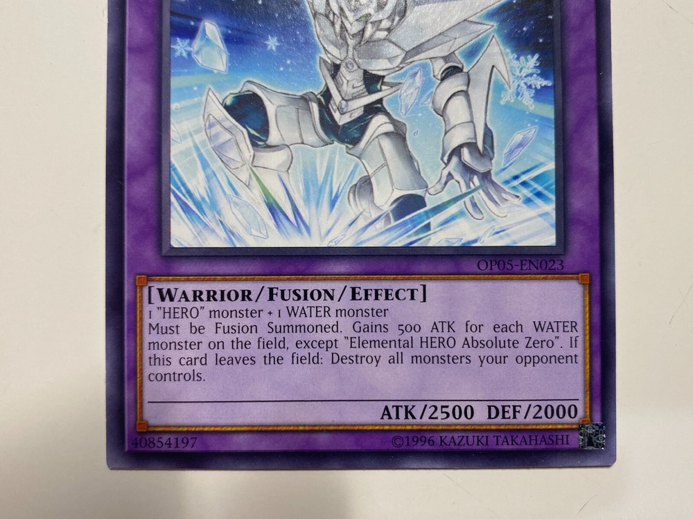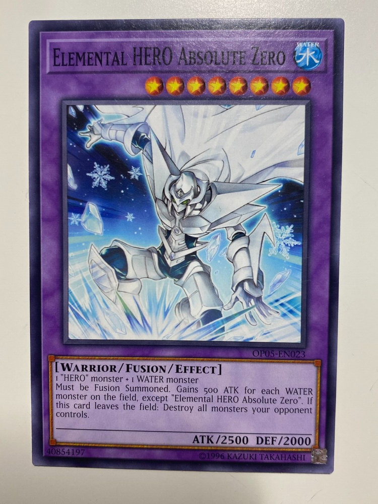 Elemental HERO Absolute Zero The card is in NM condition and will be placed in a top sleeve and loader for security. Also will include a free Holographic card which can be Super, Ultra, Secret, etc! Card Information OP05-EN023 OTS Tournament Pack 5