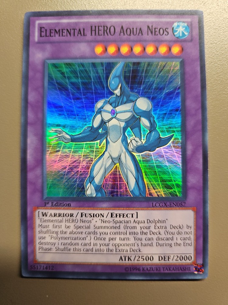 For all the Yu-Gi-Oh! fans out there, get your hands on this super rare Elemental Hero Aqua Neos card from the Legendary Collection 2 set. With its stunning artwork and 1st edition feature, this card is a must-have for any collector. The card name is boldly displayed and its rarity is emphasized, making it a highly sought-after item. The condition of the card is indicated by a specific code and type, but we won't mention those details in this description. Rest assured, this card is in top-notch condition and ready to be added to your collection. Don't miss out on the opportunity to own this incredible piece.