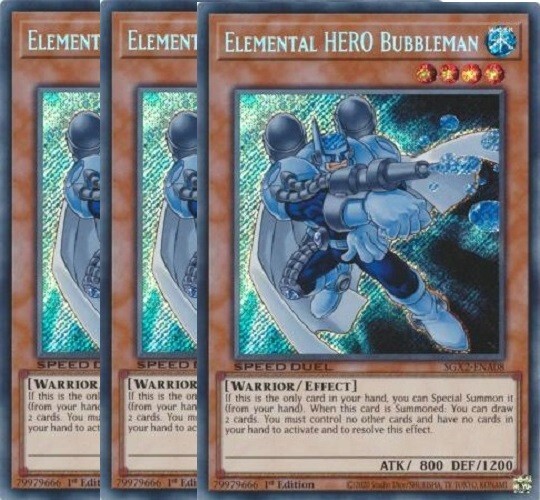 Elemental HERO Bubbleman x 3 1st Edition - Secret Rare The cards are in LP (Lightly Played) condition. Pictured cards are stock photo. Cards will be placed in a sleeve and top loader for security. Also will include a free Holographic card which can be Super, Ultra, Secret, etc! Card Information SGX2-ENA08 - 1st Edition - Secret Rare Speed Duel GX: Miterm Paradox Box