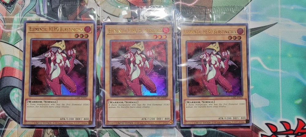 This rare and highly sought-after set of three Yugioh Elemental HERO Burstinatrix LART-EN041 Lost Art Promo cards is a must-have for any collector or fan of the game. They are all in NM condition and will be shipped in between 2 card protectors within a bubble mailer that will have tracking provided. No refunds, and happy purchasing!