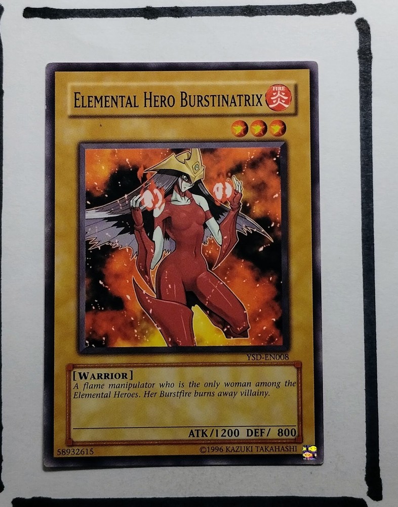Yugioh Elemental HERO Burstinatrix YSD-EN008 Unlimited Near Mint This card is in Near Mint condition. Common card from the Starter Deck 2006 set.