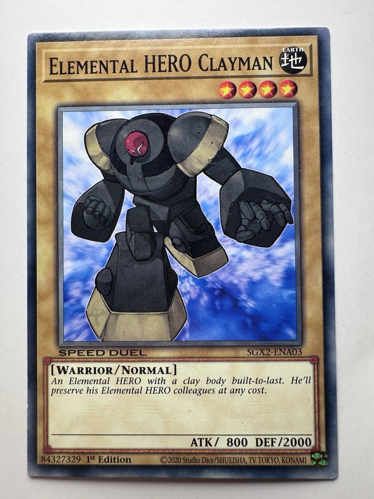 The product is a Yu-Gi-Oh! card from the set Speed Duel GX: Midterm Paradox. It is the Elemental Hero Clayman card, designated as Common rarity and 1st Edition. The card is in Near Mint condition....