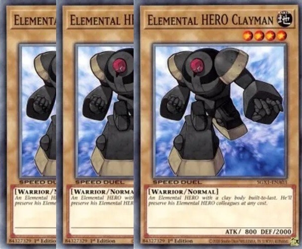 Elemental HERO Clayman x 3 1st Edition The cards are in NM condition. Cards will be placed in a sleeve and top loader for security. Also will include a free Holographic card which can be Super, Ultra, Secret, etc! Card Information SGX3-ENA04 - 1st Edition Speed Duel GX: Duelists of Shadows