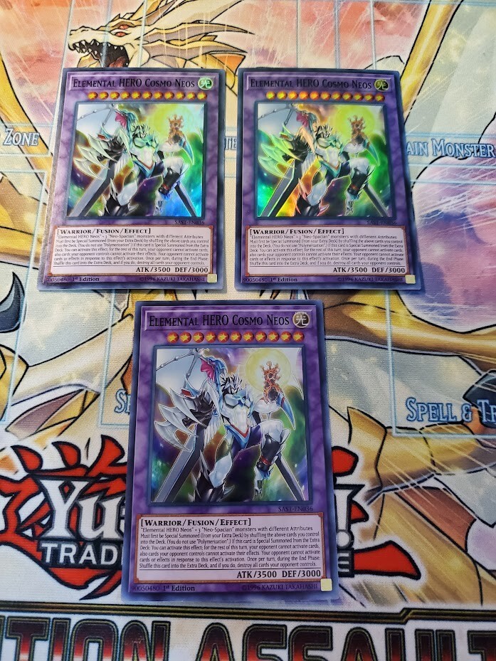 Free eBay listing template designed by dewiso.com Yugioh - Elemental HERO Cosmo Neos SAST-EN036 NM Unlimited/1st ed Super Rare x3 Product This a Yugioh Product that is being sold! Condition is exactly as pointed out in title. For you're reference: NM: Near Mint VLP: Very Lightly Played LP: Lightly Played MP: Moderately Played HP: Heavily Played Shipping This listing will be shipped via card sleeve/penny sleeve and a top loader via letter mail. If you are purchasing an order of over $150 I will provide shipping with tracking free! Contact If you have any questions whether it be more pictures of the back or clarification on an order please contact me! We will do everything to Help! Also if you have multiple items or even have specific things you are looking for, reach out and we might just have it! There are no refunds, items are final sale! If the item has been incorrectly described or wrongly sent, please send images and we will sort it out right away! If the product has X2 or X3, it means it will either come with 2 of the same card or 3 of the same card. Be sure to always check the title of the listing! Great quality products that we ship across North America! Be sure to leave a review when you receive the item! Collection and Bulk Pokemon/Yugioh Purchases If you have any collections or bulk cards that you wish to sell please contact me and send pictures of what you're looking to sell! Rates: Contact me for rates! Reminder: I am looking to make profit when buying and selling, so please when reaching out realize that we both have to profit off the transaction!