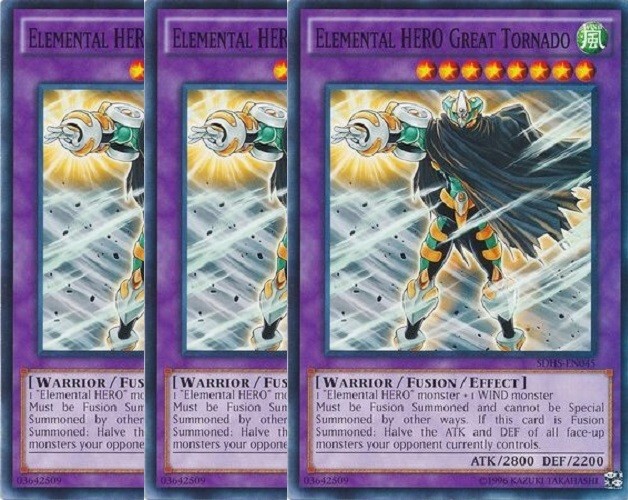 Elemental HERO Great Tornado x 3 The cards are in NM condition. Cards will be placed in a top sleeve and loader for security. Also will include a free Holographic card which can be Super, Ultra, Secret, etc! Card Information SDHS-EN045 Structure Deck: HERO Strike