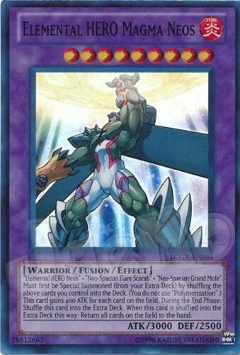 Elemental HERO Magma Neos Super Rare The card is in NM condition and will be placed in a sleeve and top loader for security. Also will include a free Holographic card which can be Super, Ultra, Secret, etc! Card Information LCGX-EN064 - Super Rare Legendary Collection 2
