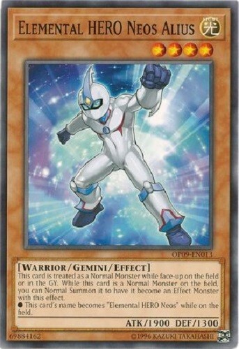 Elemental HERO Neos Alius The card is in NM condition and will be placed in a top sleeve and loader for security. Also will include a free Holographic card which can be Super, Ultra, Secret, etc! Card Information OP09-EN013 OTS Tournament Pack 9