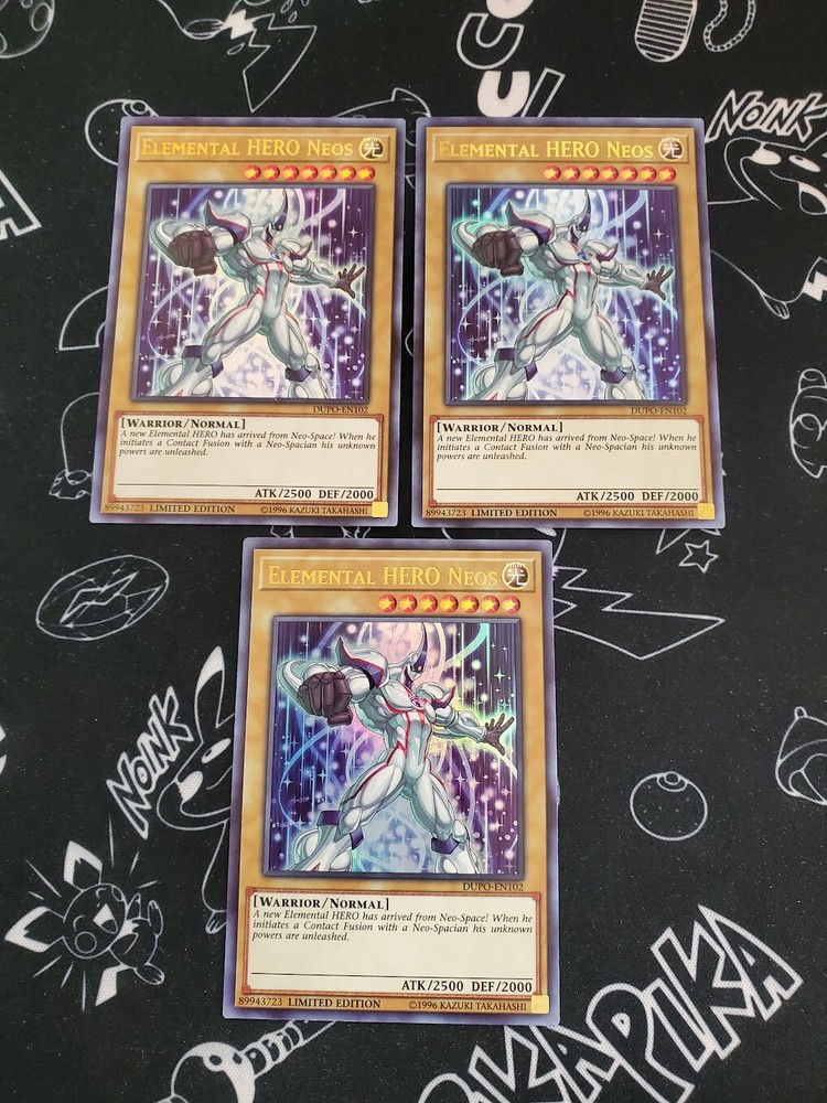 Free eBay listing template designed by dewiso.com Yugioh - Elemental HERO Neos DUPO-EN102 NM Limited Ultra Rare x3 Product This a Yugioh Product that is being sold! Condition is exactly as pointed out in title. For you're reference: NM: Near Mint VLP: Very Lightly Played LP: Lightly Played MP: Moderately Played HP: Heavily Played Shipping This listing will be shipped via card sleeve/penny sleeve and a top loader via letter mail. If you are purchasing an order of over $150 I will provide shipping with tracking free! Contact If you have any questions whether it be more pictures of the back or clarification on an order please contact me! We will do everything to Help! Also if you have multiple items or even have specific things you are looking for, reach out and we might just have it! There are no refunds, items are final sale! If the item has been incorrectly described or wrongly sent, please send images and we will sort it out right away! If the product has X2 or X3, it means it will either come with 2 of the same card or 3 of the same card. Be sure to always check the title of the listing! Great quality products that we ship across North America! Be sure to leave a review when you receive the item! Collection and Bulk Pokemon/Yugioh Purchases If you have any collections or bulk cards that you wish to sell please contact me and send pictures of what you're looking to sell! Rates: Contact me for rates! Reminder: I am looking to make profit when buying and selling, so please when reaching out realize that we both have to profit off the transaction!