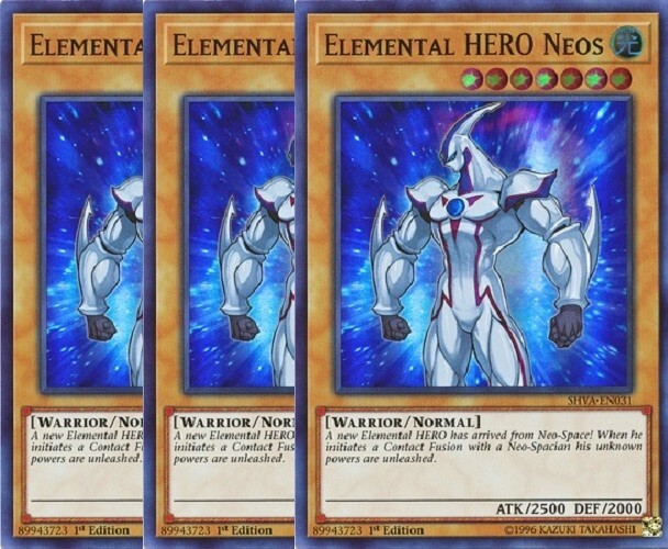Elemental HERO Neos x 3 1st Edition - Super Rare The cards are in NM condition. Cards will be placed in a top sleeve and loader for security. Also will include a free Holographic card which can be Super, Ultra, Secret, etc! Card Information SHVA-EN031 - 1st Edition - Super Rare Shadows in Valhalla