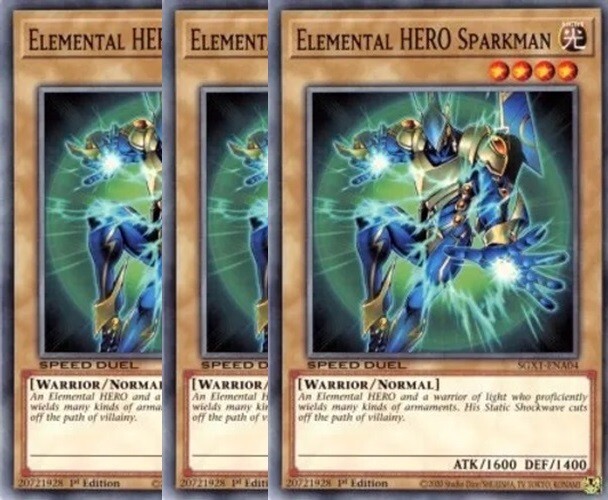 Elemental HERO Sparkman x 3 1st Edition The cards are in NM condition. Cards will be placed in a top sleeve and loader for security. Also will include a free Holographic card which can be Super, Ultra, Secret, etc! Card Information SGX1-ENA04 - 1st Edition Speed Duel GX: Duel Academy Box