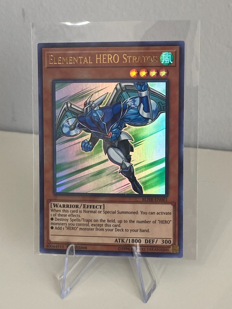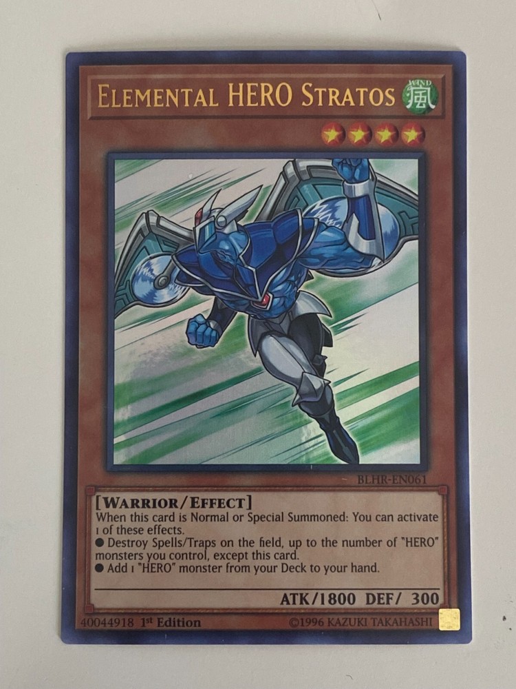 Elemental HERO Stratos 1st Edition - Ultra Rare The card is in NM condition. Also will include a free Holographic card which can be a rarity of Super, Ultra, Secret, etc! Card Information When this card is Normal or Special Summoned: You can activate 1 of these effects. • Destroy Spells/Traps on the field, up to the number of " HERO " monsters you control, except this card. • Add 1 "HERO" monster from your deck to your hand. Number: BLHR-EN061 Rarity: Ultra Rare