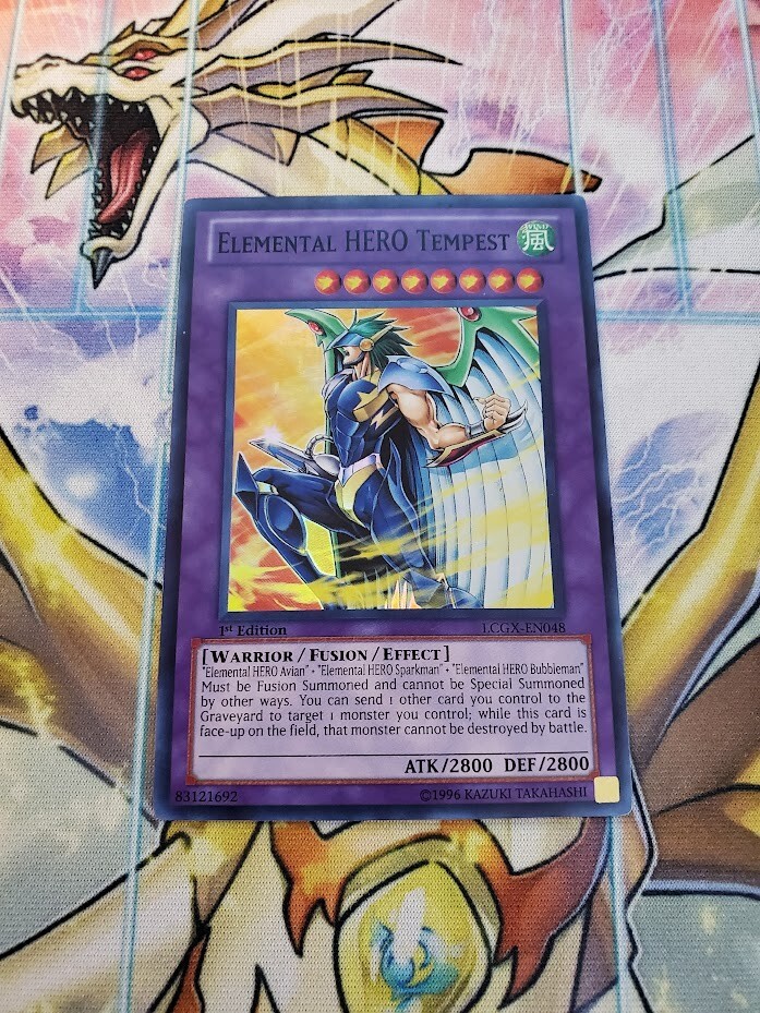 Free eBay listing template designed by dewiso.com Yugioh - Elemental HERO Tempest LCGX-EN048 NM 1st ed Super Rare Product This a Yugioh Product that is being sold! Condition is exactly as pointed out in title. For you're reference: NM: Near Mint VLP: Very Lightly Played LP: Lightly Played MP: Moderately Played HP: Heavily Played Shipping This listing will be shipped via card sleeve/penny sleeve and a top loader via letter mail. If you are purchasing an order of over $150 I will provide shipping with tracking free! Contact If you have any questions whether it be more pictures of the back or clarification on an order please contact me! We will do everything to Help! Also if you have multiple items or even have specific things you are looking for, reach out and we might just have it! There are no refunds, items are final sale! If the item has been incorrectly described or wrongly sent, please send images and we will sort it out right away! If the product has X2 or X3, it means it will either come with 2 of the same card or 3 of the same card. Be sure to always check the title of the listing! Great quality products that we ship across North America! Be sure to leave a review when you receive the item! Collection and Bulk Pokemon/Yugioh Purchases If you have any collections or bulk cards that you wish to sell please contact me and send pictures of what you're looking to sell! Rates: Contact me for rates! Reminder: I am looking to make profit when buying and selling, so please when reaching out realize that we both have to profit off the transaction!