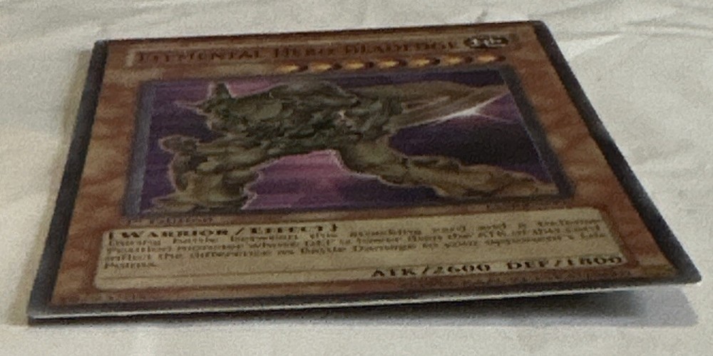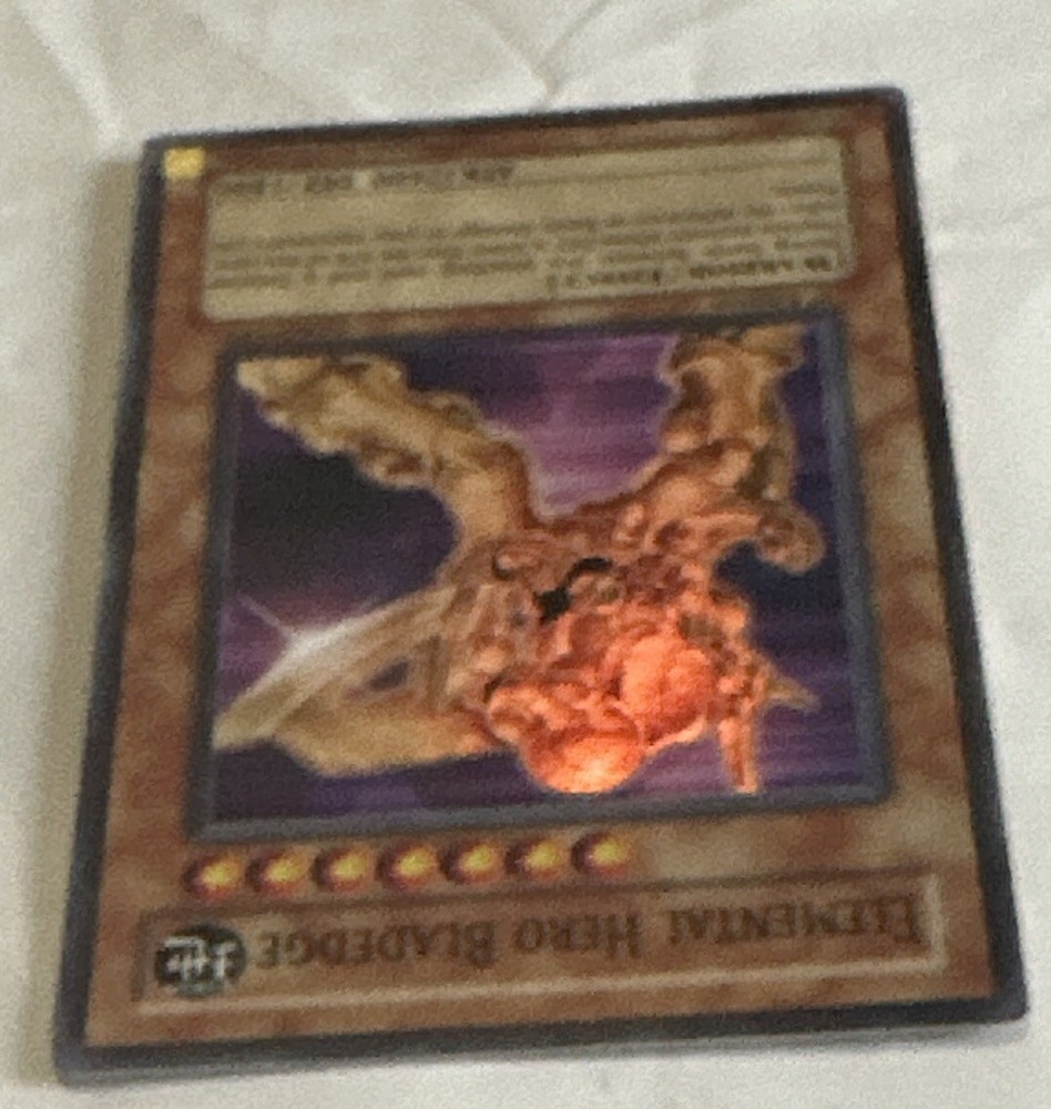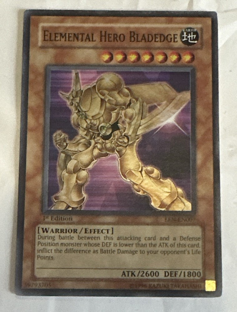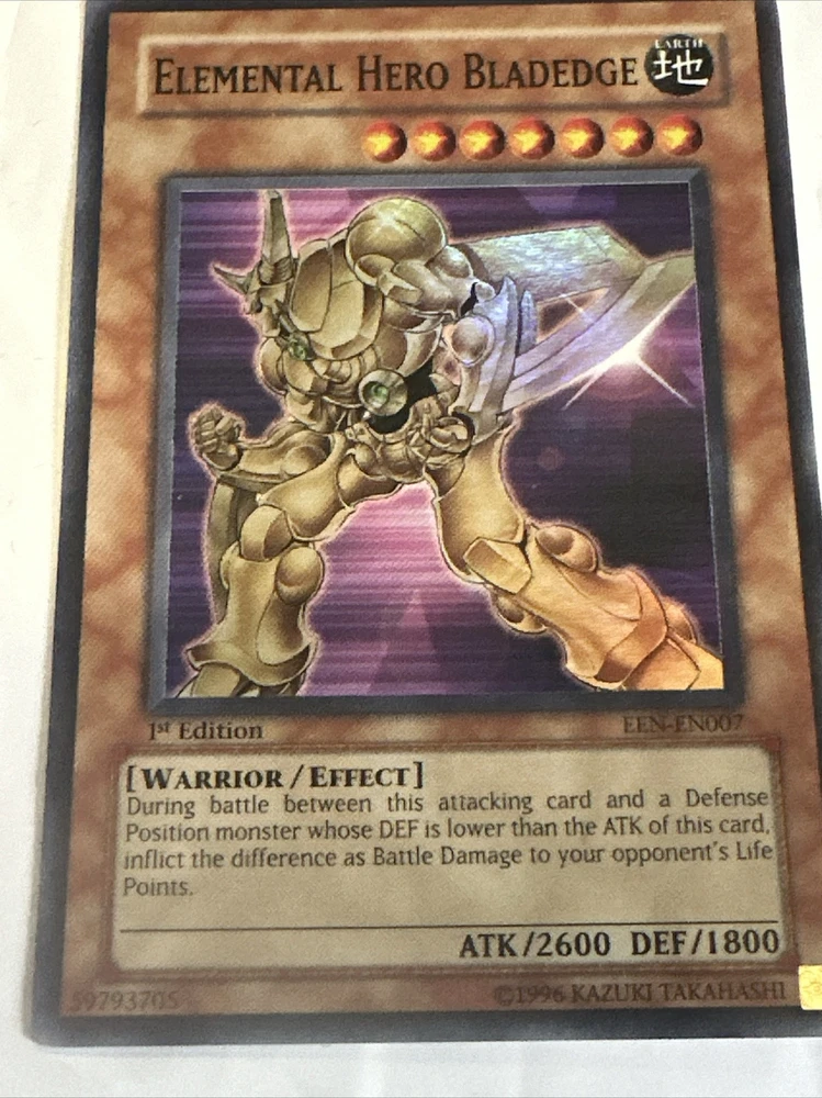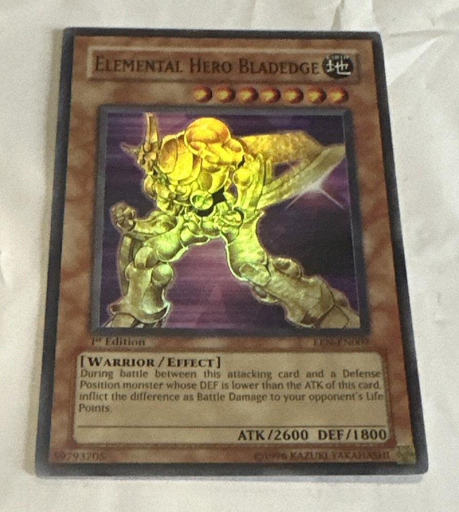 This is the ultimate rare 1st edition English Elemental Hero Bladedge card from the Yu-Gi-Oh! TCG. The card size is Japanese and it is made of card stock material by Konami. This collectible card game individual card features an autograph of the character and has a rarity level of ultimate rare. It is perfect for any Yu-Gi-Oh! TCG enthusiast who loves collecting rare cards.