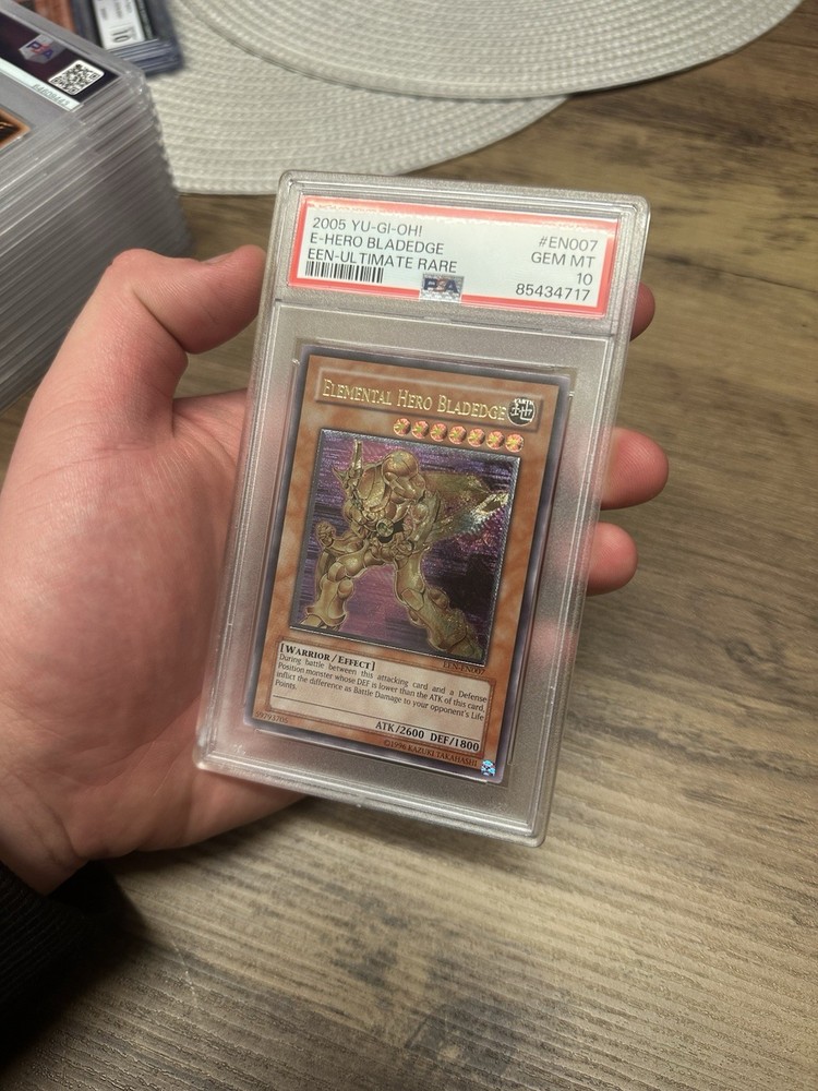 Enhance your Yu-Gi-Oh! TCG collection with the esteemed Elemental Hero Bladedge, from the Elemental Energy set. This card boasts the coveted Ultimate Rare rarity, accentuated by a stunning Holo finish that makes it a standout piece for both collectors and players. Card number EEN EURO has been meticulously evaluated by the Professional Sports Authenticator (PSA), receiving a perfect grade of 10. Confirming its impeccable state, this non-autographed card by Konami is a testament to quality and preservation, ready to take its rightful place in a distinguished collection.
