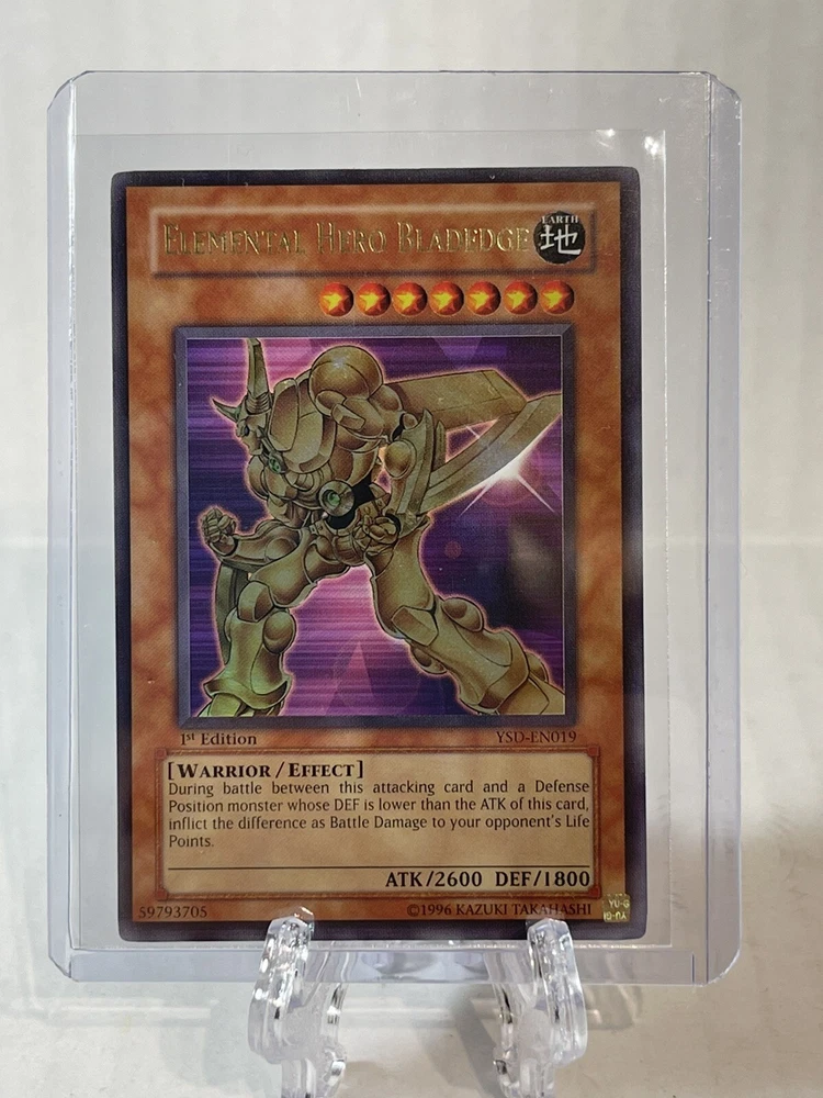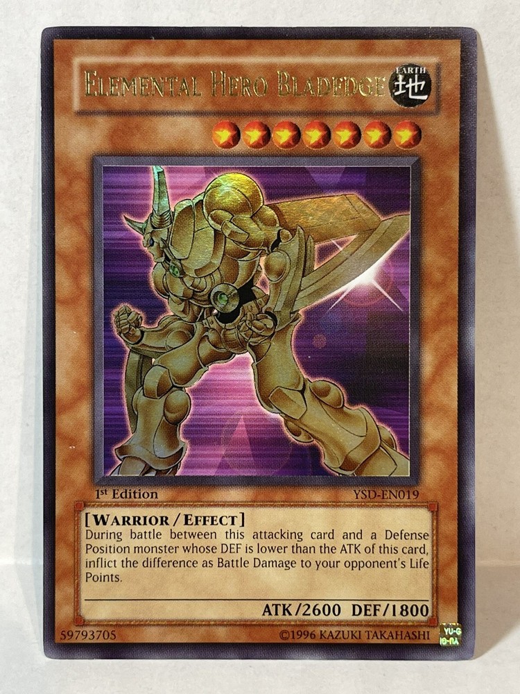 Yugioh Elemental Hero Bladedge Ultimate Rare YSD-EN019 1st Edition - NM Card is in good shape. Card has normal signs of very light play. I would say near mint but there’s a pin size round indentation on the left side of the card. (See photo) It’s not punctured through. See photos for more detail Message me if you have questions and offers