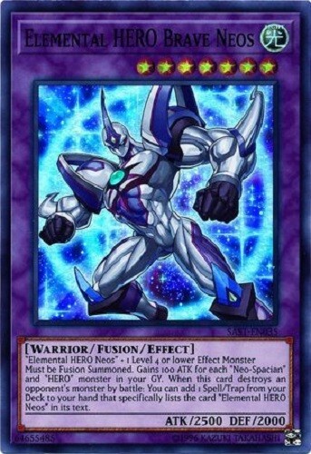 Elemental Hero Brave Neos Super Rare The card is in NM condition and will be placed in a top sleeve and loader for security. Also will include a free Holographic card which can be Super, Ultra, Secret, etc! Card Information SAST-EN035 - Super Rare Battles of Legend: Light's Revenge