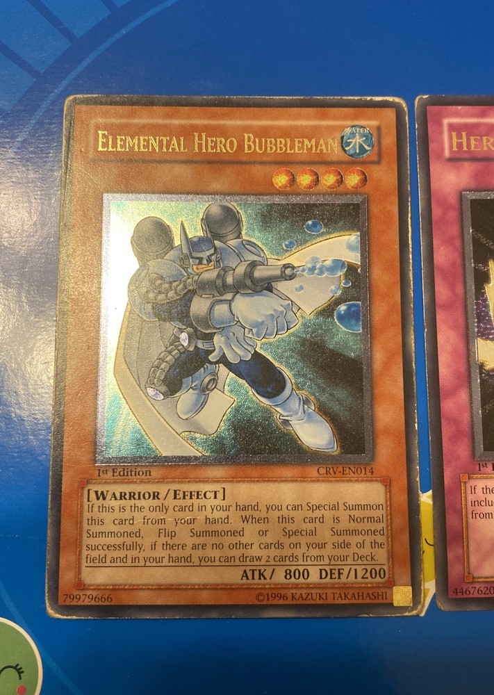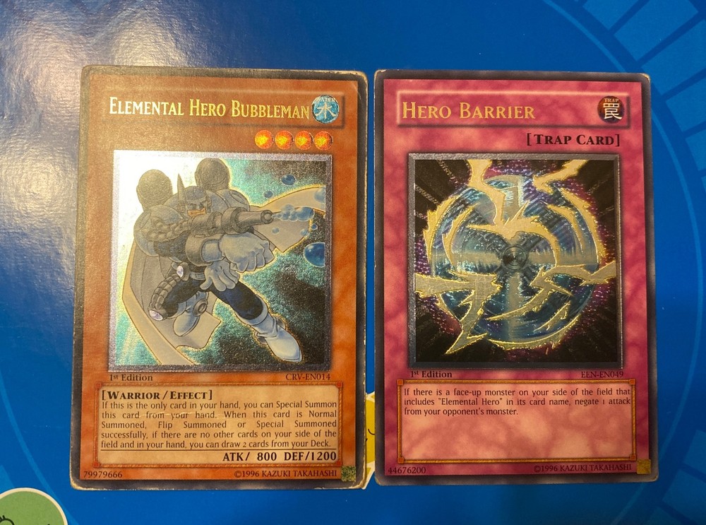 Yugioh - Elemental Hero Bubbleman CRV-EN014 + Hero Barrier EEN-EN049 1st ULT SET. Condition is Ungraded. Shipped with USPS Ground Advantage.
