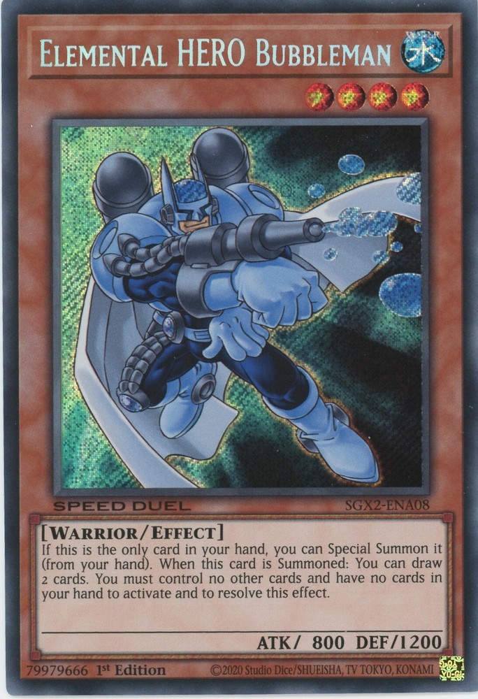 Yugioh Elemental Hero Bubbleman SGX2-ENA08 Secret Rare 1st Edition NM You can find more Yu-Gi-Oh cards of all value and rarity in our other listings All cards are in excellent condition unless stated otherwise and the photos are of cards we own but may not be the exact card you receive due to the quantities listed.