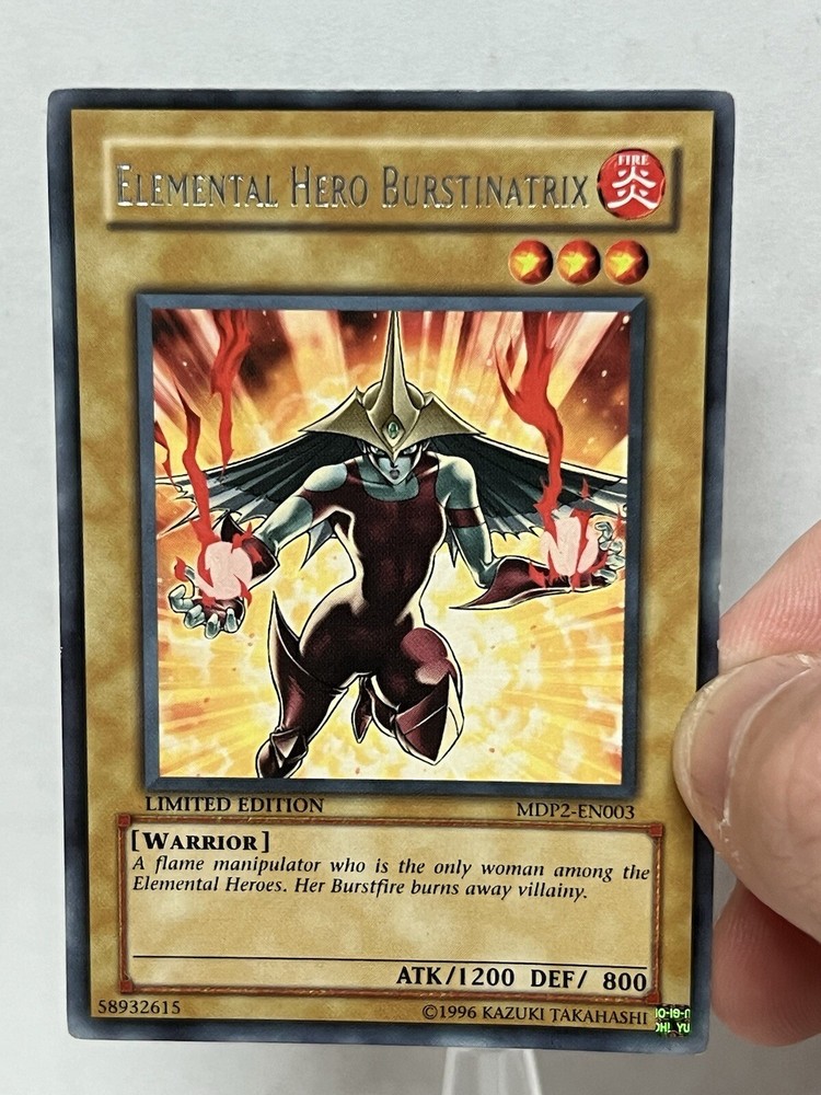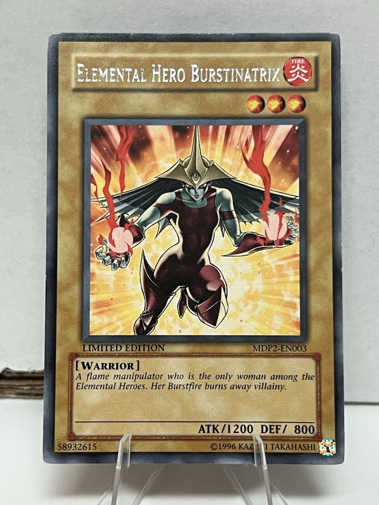 Elemental Hero Burstinatrix, a powerful addition to any Yu-Gi-Oh! collection, hails from the MDP2 - McDonalds Promo Cards Series 2 set. This rare, limited edition card features a stunning foil finish that captures the eye with its fiery warrior essence. With its distinct fire attribute, this card is a must-have for players and collectors alike, aiming to bolster decks with its unique abilities. The card's normal type ensures it fits seamlessly into existing collections, while its ungraded status leaves it open for professional assessment. As a product of Konami's craftsmanship, the Elemental Hero Burstinatrix, card number MDP2-EN003, stands as a testament to the game's rich history and ongoing legacy.