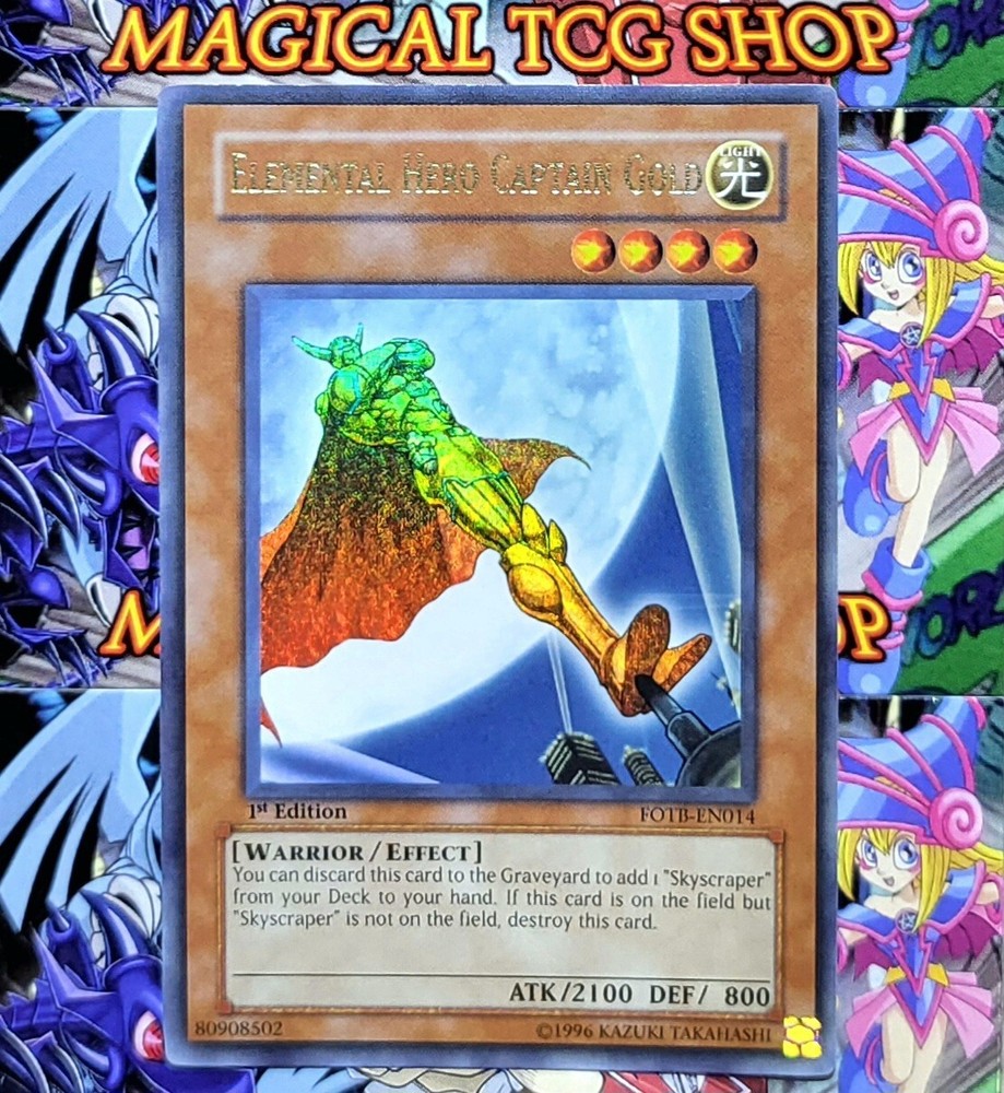Thank you for taking your valuable time to read my description. You will receive the exact genuine and authentic Yu-Gi-Oh card that you see in the photos for this listing. You are purchasing a 1st Edition Ultra Rare Elemental Hero Captain Gold FOTB-EN014 from the Force of The Breaker set released in 2007 by Konami. Please refer to the photos for the condition of the card. If you require additional photos, please send me a message and I will provide you with the photos you need. Quality Shipping with maximum protection and it is free! Your order is very important to me, I package each order as if I were going to receive it myself and I know exactly how it feels to receive a damaged item (it is very disappointing). Your card will be handled with extreme care and delicacy. I make it a priority to provide you with the absolute best protection for your purchase. Your card will be inserted into a brand new plastic card sleeve, placed in a new hard plastic top loader, sealed inside of a new plastic team bag, properly set between 2 pieces of hand cut cardboard fit to match the top loader, wrapped in a layer of bubble wrap and mailed in a bubble padded mailer to ensure a safe delivery to your home. Same day Handling! Your order will ship the same business day that you place the order for orders placed before 5:00 PM (Eastern Standard Time) Mon-Fri. Your order will be shipped USPS 1st Class and tracking information is provided with your purchase. If you have any questions, send me a message and I will respond promptly. I appreciate your time, Thank you.