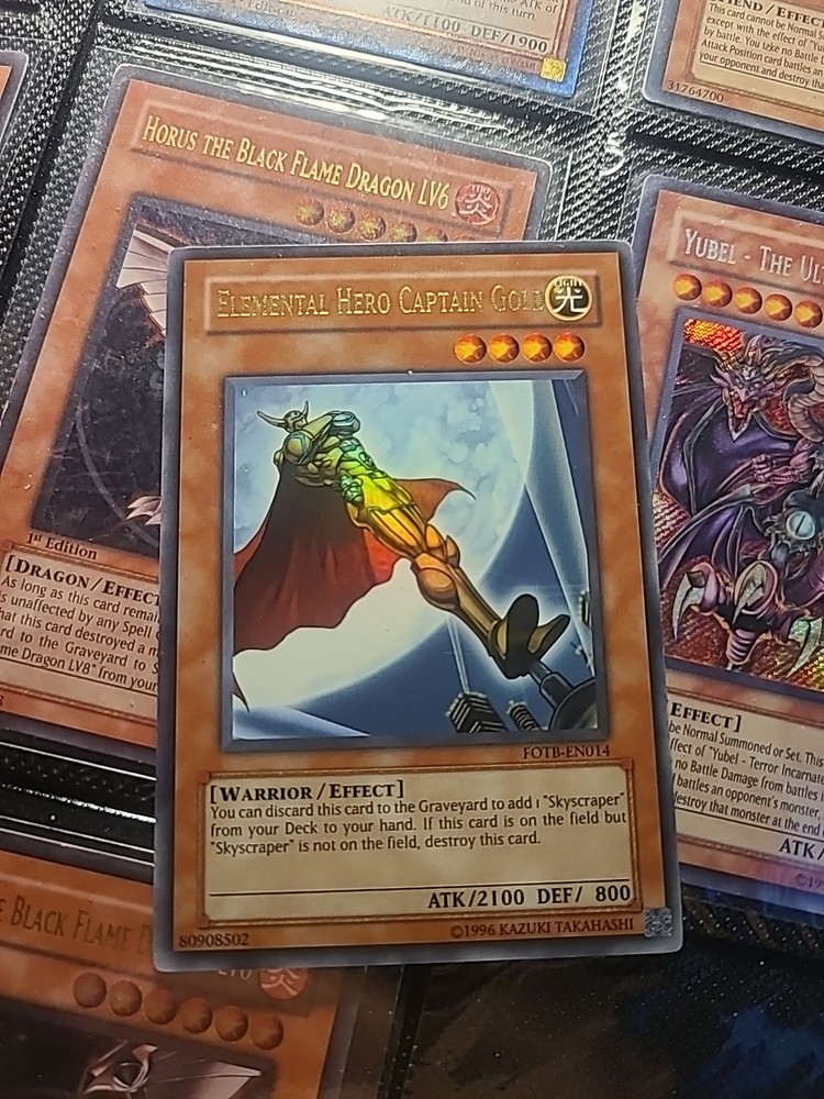 Elemental Hero Captain Gold FOTB-EN014 UNL Ed. is a highly sought-after card for any Yu-Gi-Oh! collector. This Ultra Rare card from the Force of the Breaker set is a must-have for any serious player or collector. With its 1st Edition feature, this card is a true gem for anyone looking to add to their collection. The card's rarity and edition make it a valuable addition to any Yu-Gi-Oh! game. Its unique features and abilities make it a powerful card for any player looking to enhance their gameplay. Don't miss out on the opportunity to own this rare and valuable card.