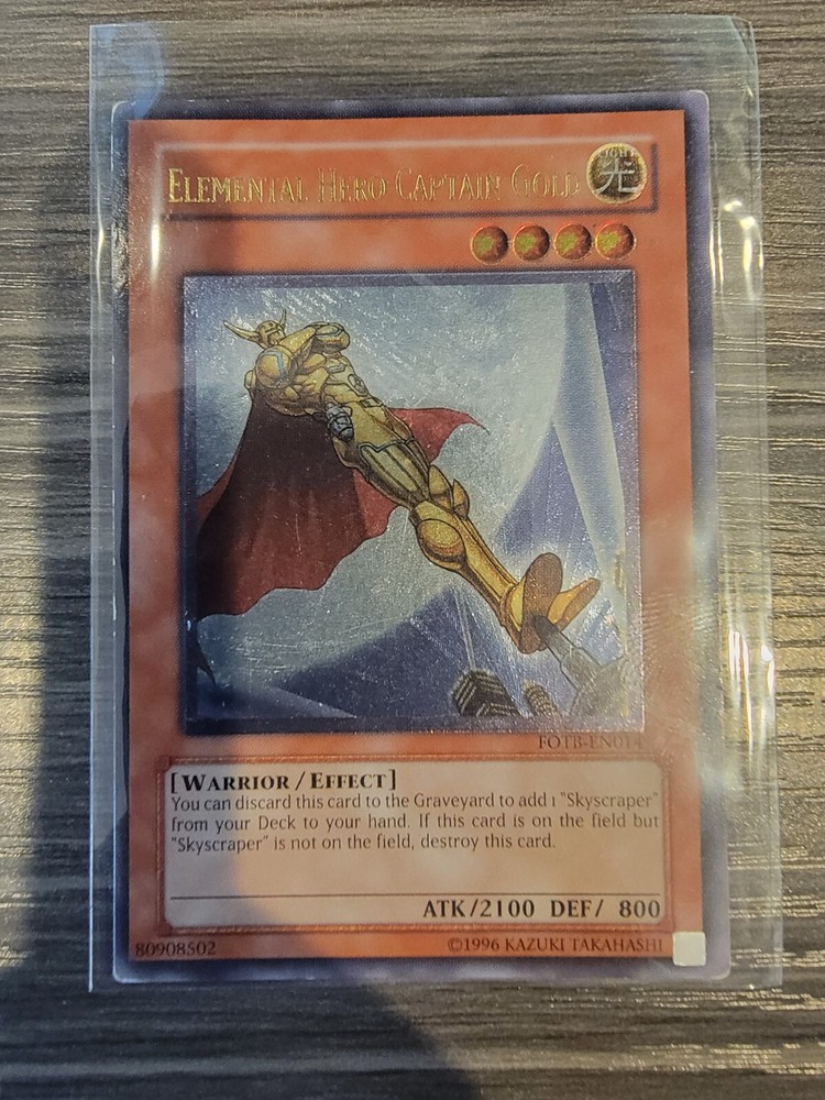 This highly sought-after card, the Yu-Gi-Oh! TCG Elemental Hero Captain Gold - FOTB-EN014 - Ultimate Rare - Unlimited LP, is a true gem for collectors and players alike. With stunning artwork and 1st edition features, this card is the perfect addition to any collection or deck. Crafted by the esteemed manufacturer Konami, this English language card boasts a rarity of Ultimate Rare. Its condition type is 4000 and its card name is Elemental Hero Captain Gold. Whether you're a die-hard fan of the Yu-Gi-Oh! franchise or simply seeking to add a valuable treasure to your collection, this card is sure to impress.