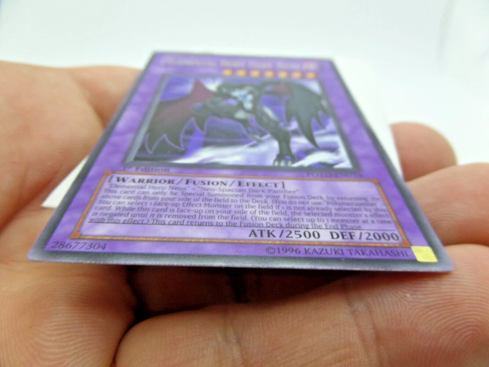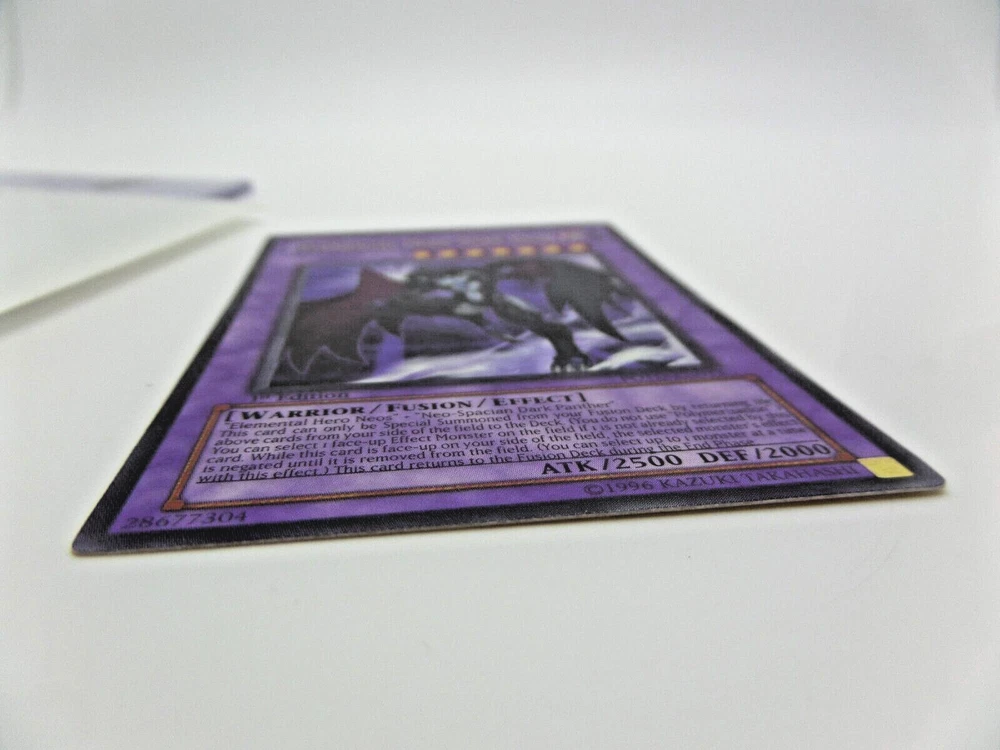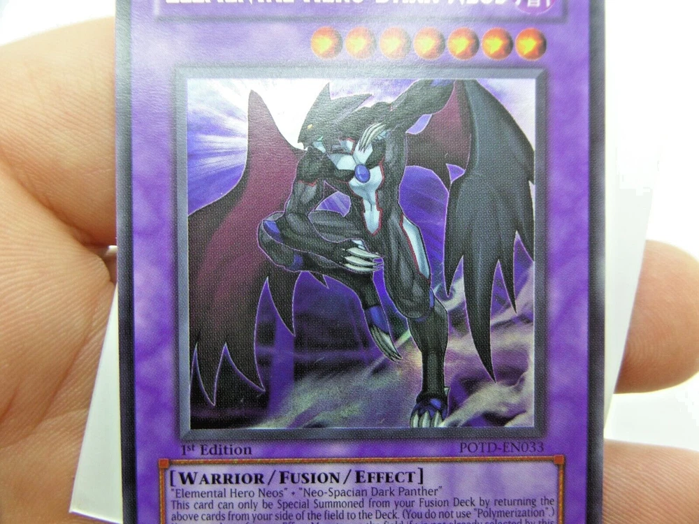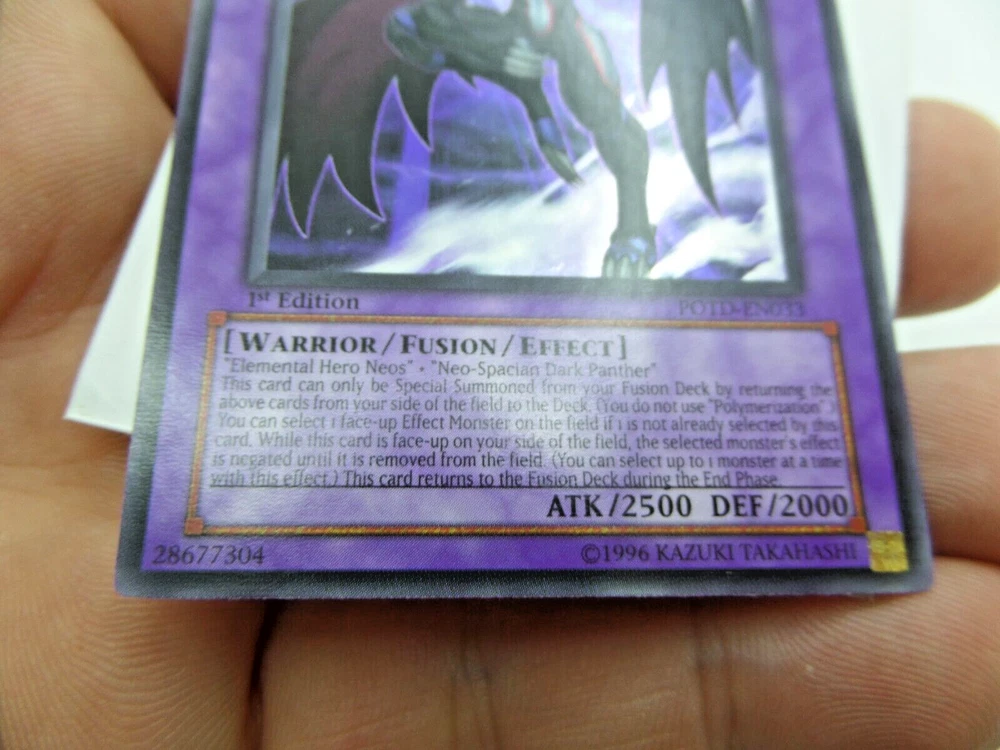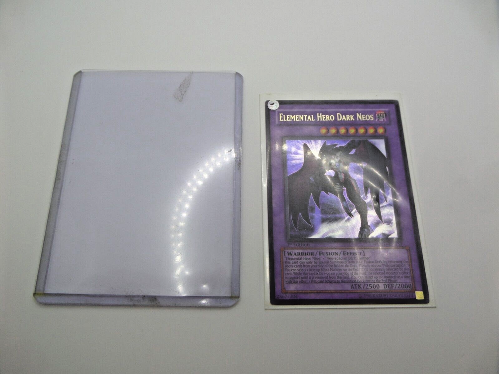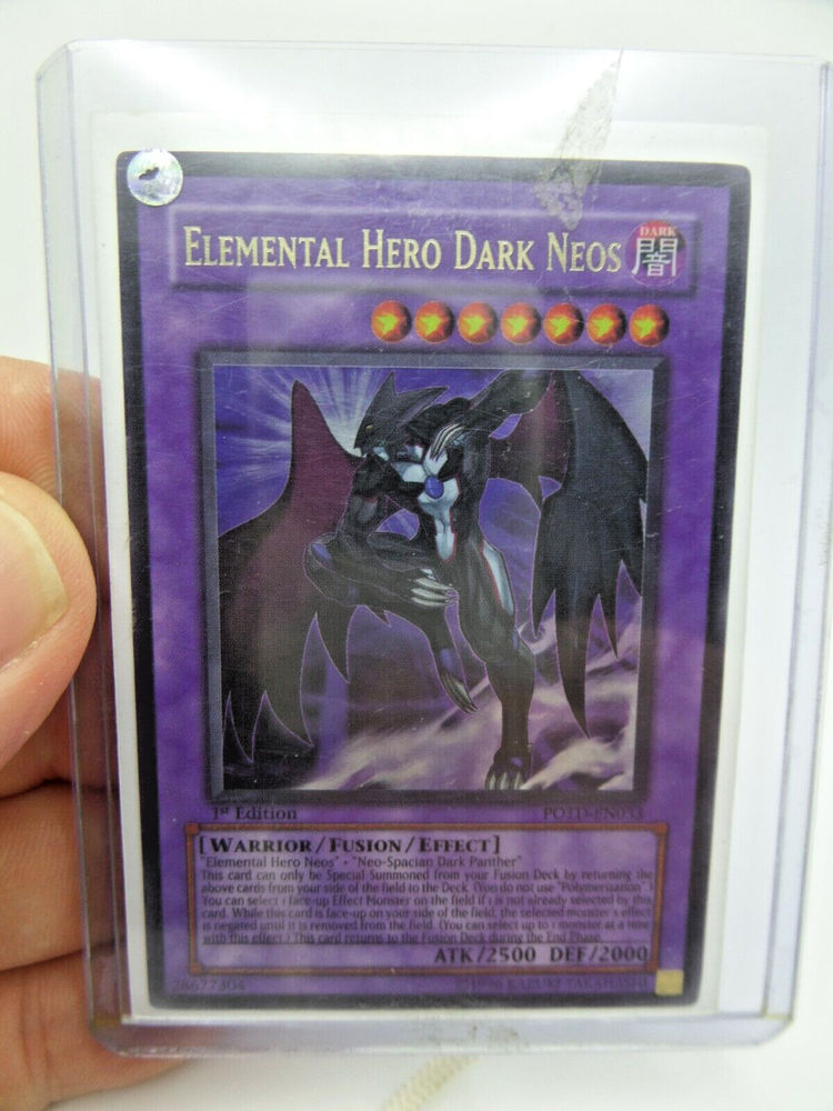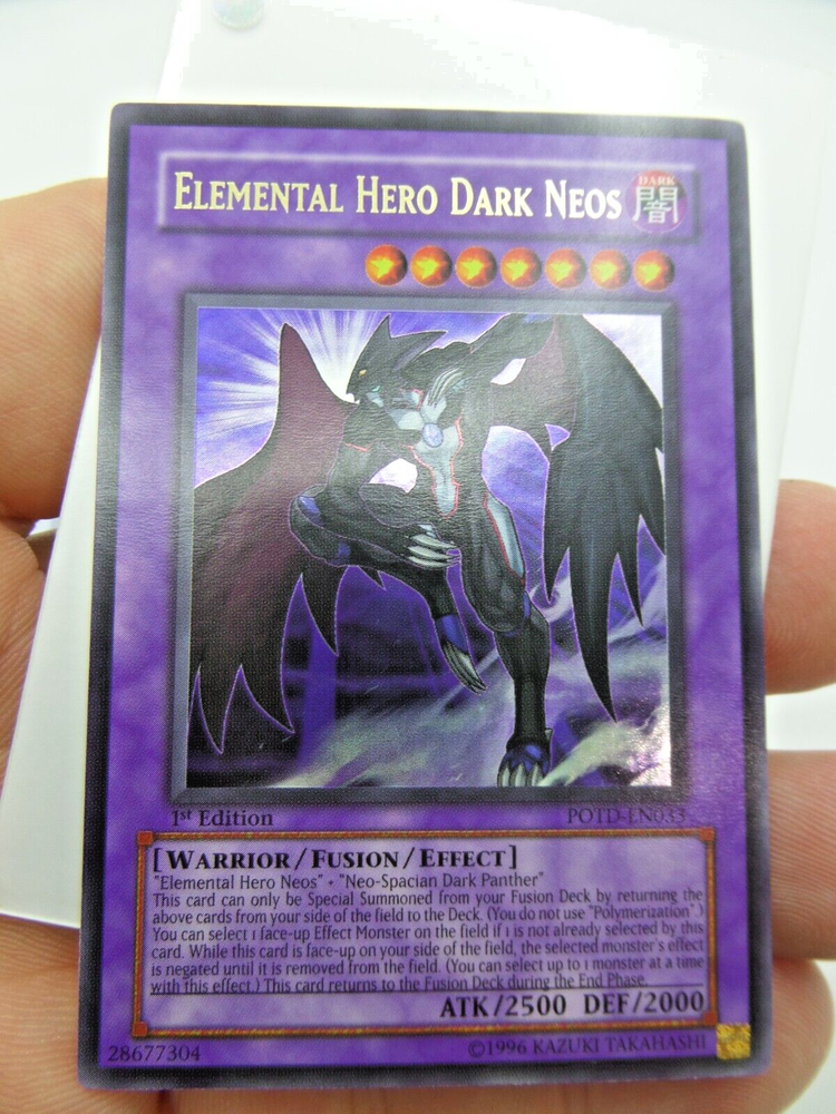 1 = Yugioh Elemental Hero Dark Neos 1st Edition POTD-EN033 Power of the Duelist Card. **CARDS ARE NOT GRADED or THOROUGHLY CHECKED FOR SCRATCHES, SCUFFS, BENT ENDS, ETC - PLEASE SEE PICTURES** (We can take 1-5 pictures for you if needed, please just ask us through eBay messenger) Card looks like its in fairly good shape, but we are NOT card experts, So please check out the pictures on this card Yourself. 1st edition, 1996 Kazuki Takahashi/ Konami Trading Card Game. Card is in two sleeves. Came out of an Estate Sale from a collector - we will be posting more cards up as fast as we can. This card has scuffs, scratches, bent ends, other damage, etc. ***ALL CARDS ARE SOLD AS-IS WHERE IS, NO REFUNDS, NO RETURNS, NOT GRADED, COULD HAVE DAMAGE, YOU'RE TAKING FULL RISK.*** FREE USPS SHIPPING TO LOWER 48 STATES ONLY. Elemental Hero Dark Neos - Power of the Duelist Product Details Elemental Hero Neos + Neo-Spacian Dark Panther This card can only be Special Summoned from your Fusion Deck by returning the above cards from your side of the field to the Deck. (You do not use Polymerization.) You can select 1 face-up Effect Monster on the field if it''s not already selected by this card. While this card is face-up on your side of the field, the selected monster''s effect is negated until it is removed from the field. (You can select up to 1 monster at a time with this effect.) This card returns to the Fusion Deck during the End Phase. Number: POTD-EN033 Rarity: Ultra Rare Attribute Monster Type/Card Type: DARK Warrior/Fusion/Effect Monster Level: 7 A / D: 2500 / 2000