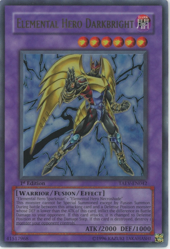 Yugioh Elemental Hero Darkbright TAEV-EN042 Ultra Rare 1st Edition NM You can find more Yu-Gi-Oh cards of all value and rarity in our other listings All cards are in excellent condition unless stated otherwise and the photos are of cards we own but may not be the exact card you receive due to the quantities listed.