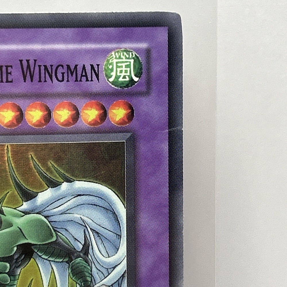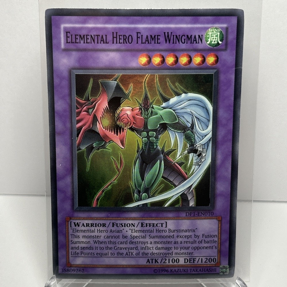 The product is a Yu-Gi-Oh! TCG card featuring "Elemental Hero Flame Wingman" in Super Rare rarity from the set DP1-EN010. This card is in moderately played condition, indicating it is still in very good shape despite some signs of wear. It is a Japanese-sized card and is considered vintage, making it a sought-after collectible for fans of the game. The card is part of the BREAK specialty, showcasing its unique abilities and attributes within the Yu-Gi-Oh! TCG universe. Crease on side See pics YG 103