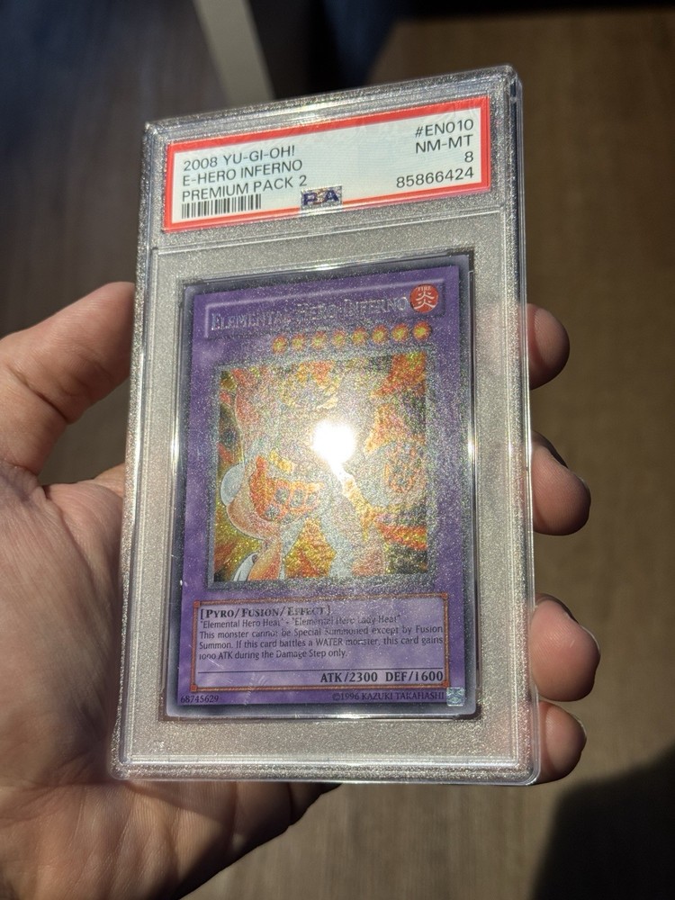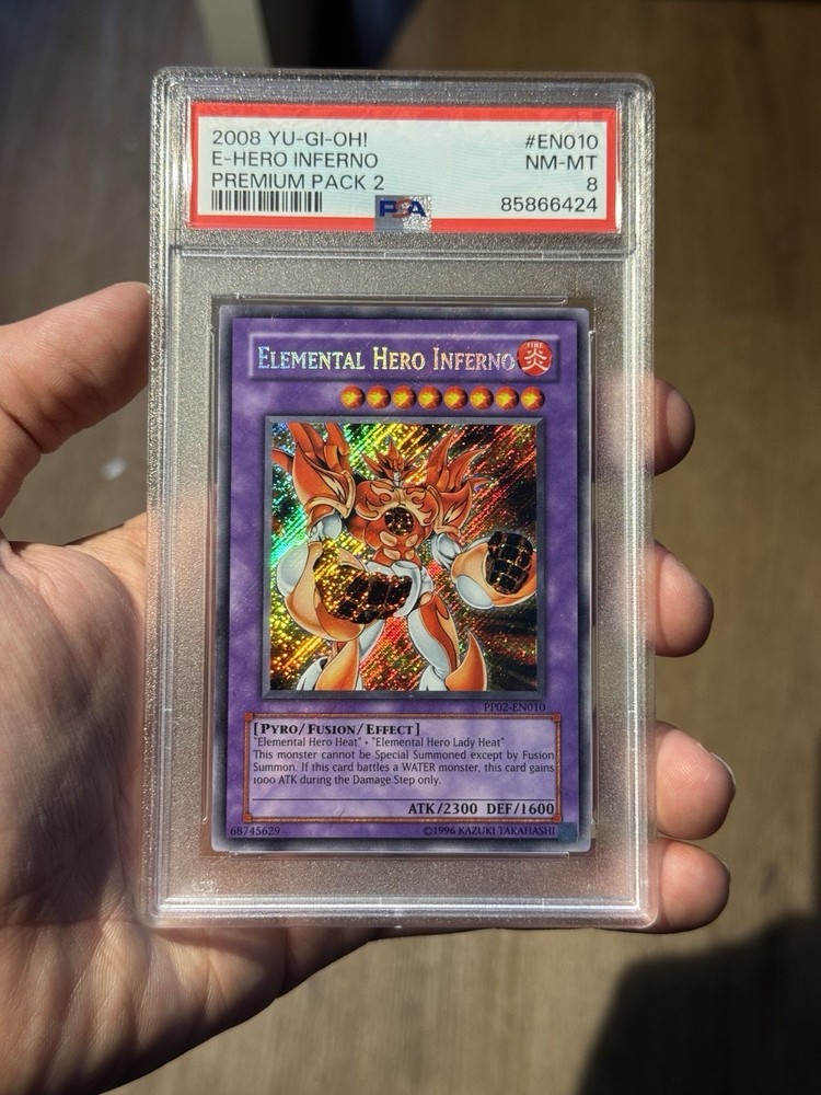 This Yugioh Elemental Hero Inferno in PSA 8 condition is a must-have for collectors! The card looks fantastic, matching the photos exactly, and the secret rare finish really pops. Seller is responsive if you have questions. A great addition to any serious Yugioh collection—definitely worth it!
