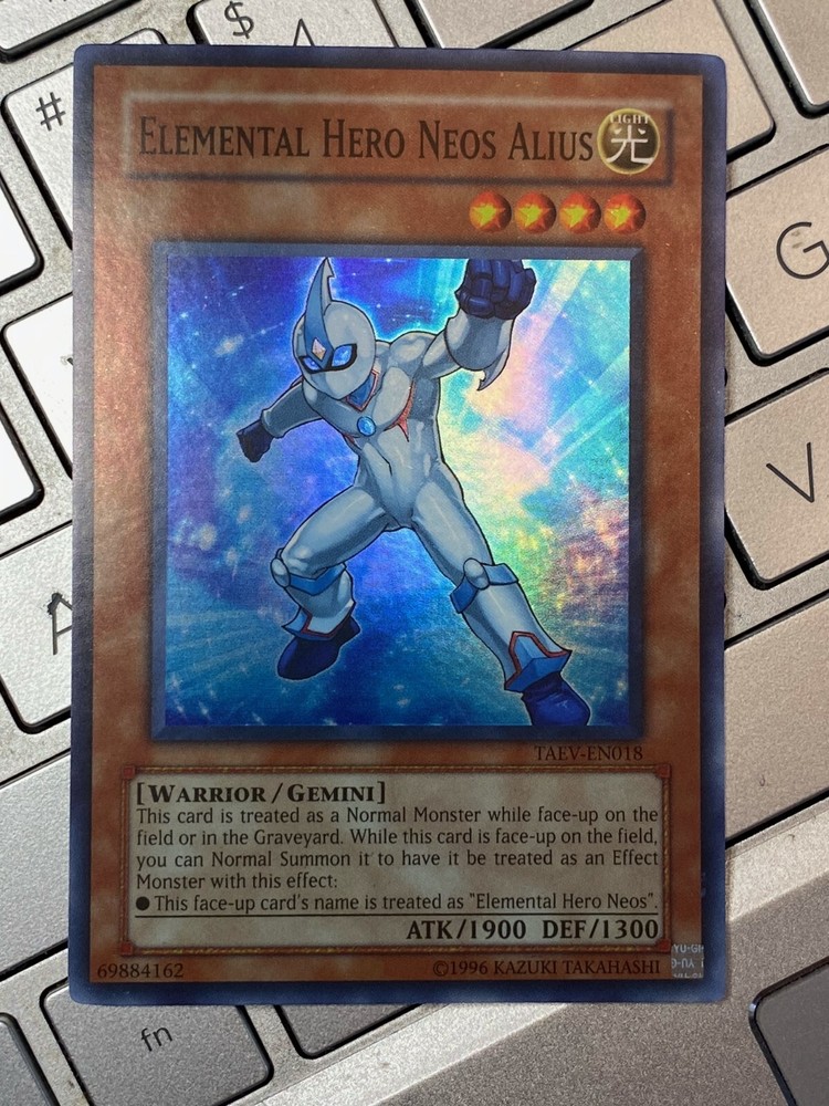 Yugioh Elemental Hero Neos Alius TAEV-EN018 / unlimited / Super Rare Holo near mint condition card Shipping includes tracking and delivery confirmation. Up g r a d e or Complete Your Collection! We make every attempt to ship out your stuff as soon as possible and get everything shipped out within 1 business days. Thanks for looking. We do combine on the shipping; just add to a cart and once done with all your purchases, checkout by clicking on the shopping cart icon at the top right of your screen. The shipping discounts and combined shipping are already set up for you.