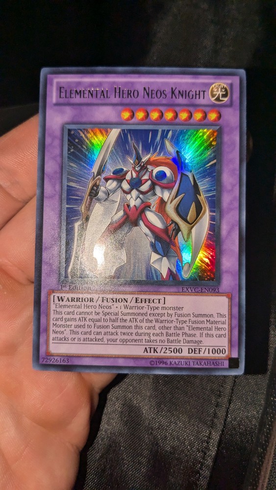 | Card Text | Elemental Hero Neos + 1 Warrior-Type monster // This card cannot be Special Summoned except by Fusion Summon. This card gains ATK equal to half the ATK of the Warrior-Type Fusion Material Monster used to Fusion Summon this card, other than Elemental Hero Neos. This card can attack twice during each Battle Phase. If this card attacks or is attacked, your opponent takes no Battle Damage. |
