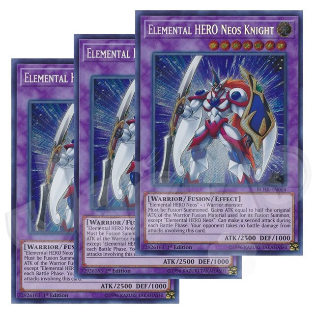 Elemental HERO Neos Knight x 3 1st Edition - Secret Rare The cards are in NM condition. Also will include a free Holographic card which can be a rarity of Super, Ultra, Secret, etc! Card Information "Elemental HERO Neos" + 1 Warrior monster Must be Fusion Summoned. Gains ATK equal to half the original ATK of the Warrior Fusion Material used for its Fusion Summon, except "Elemental HERO Neos". Can make a second attack during each Battle Phase. Your opponent takes no battle damage from attacks involving this card. Number: BLHR-EN064 Rarity: Secret Rare