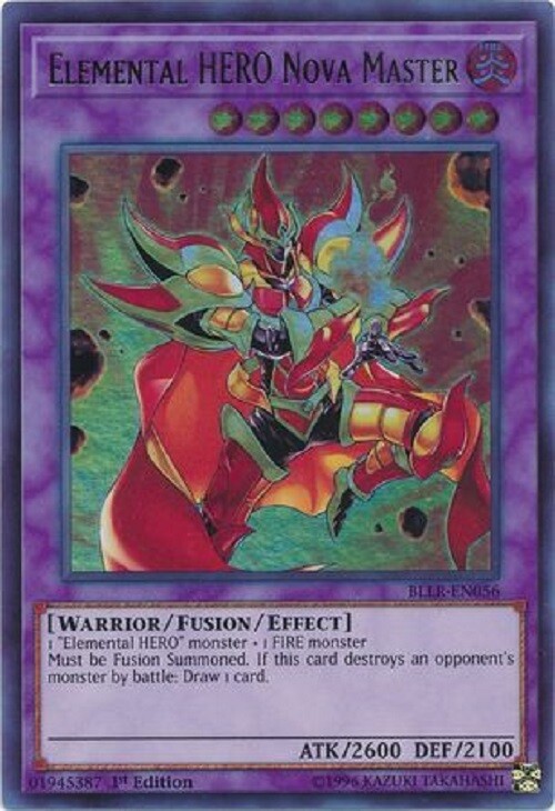 Elemental Hero Nova Master Fusion Set with Polymerization This auction is for 4 cards and all are in NM condition. Cards will be placed in a top sleeve and loader for security. Also will include a free Holographic card which can be Super, Ultra, Secret, etc! Card Information Elemental Hero Nova Master - BLLR-EN056 - 1st Edition Elemental Hero Heat - SDHS-EN005 - 1st Edition Elemental Hero Neos - SDHS-EN007 Polymerization - YGLD-ENB30