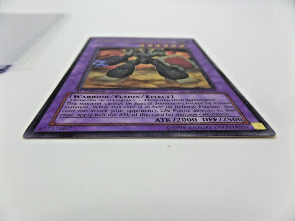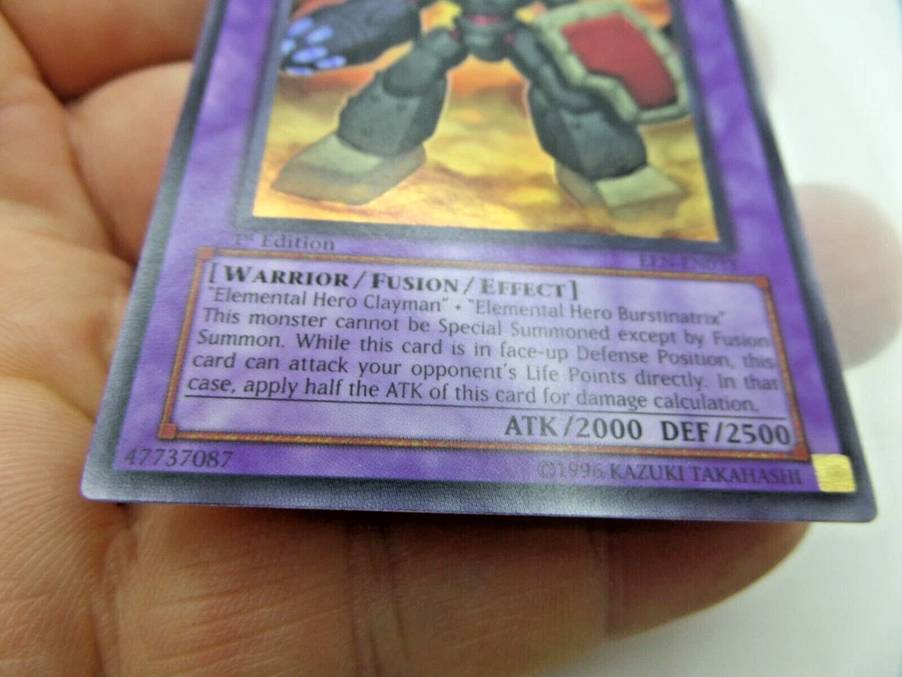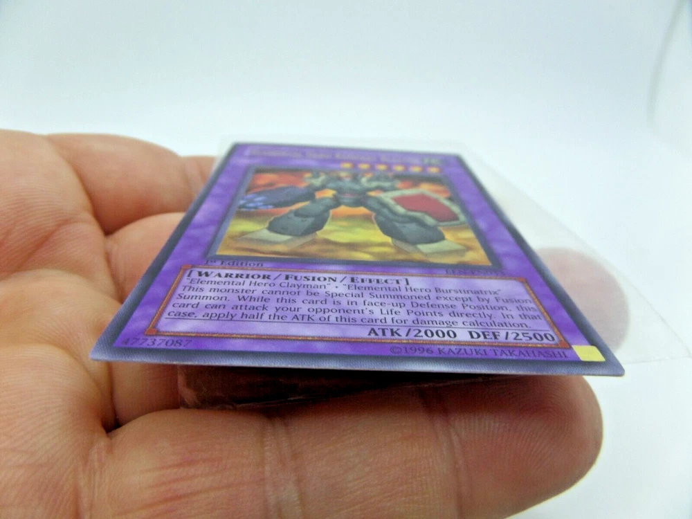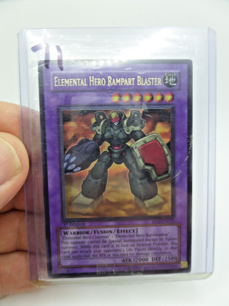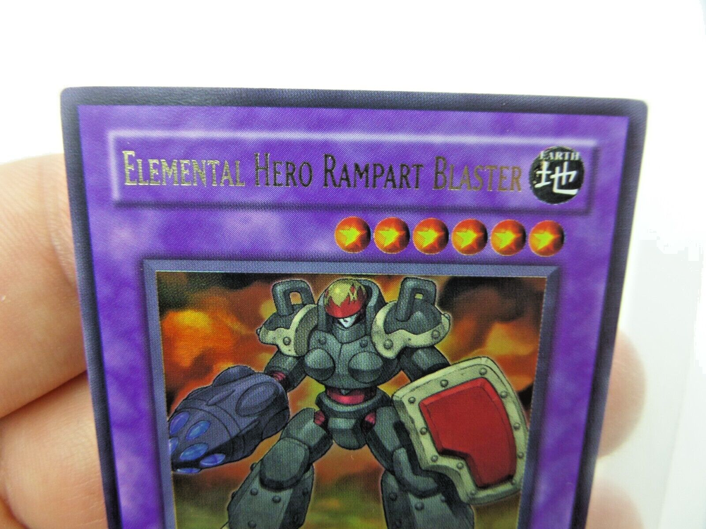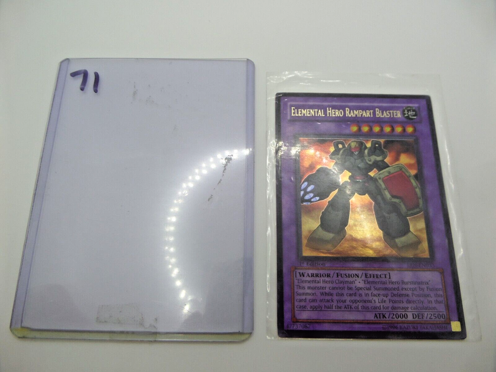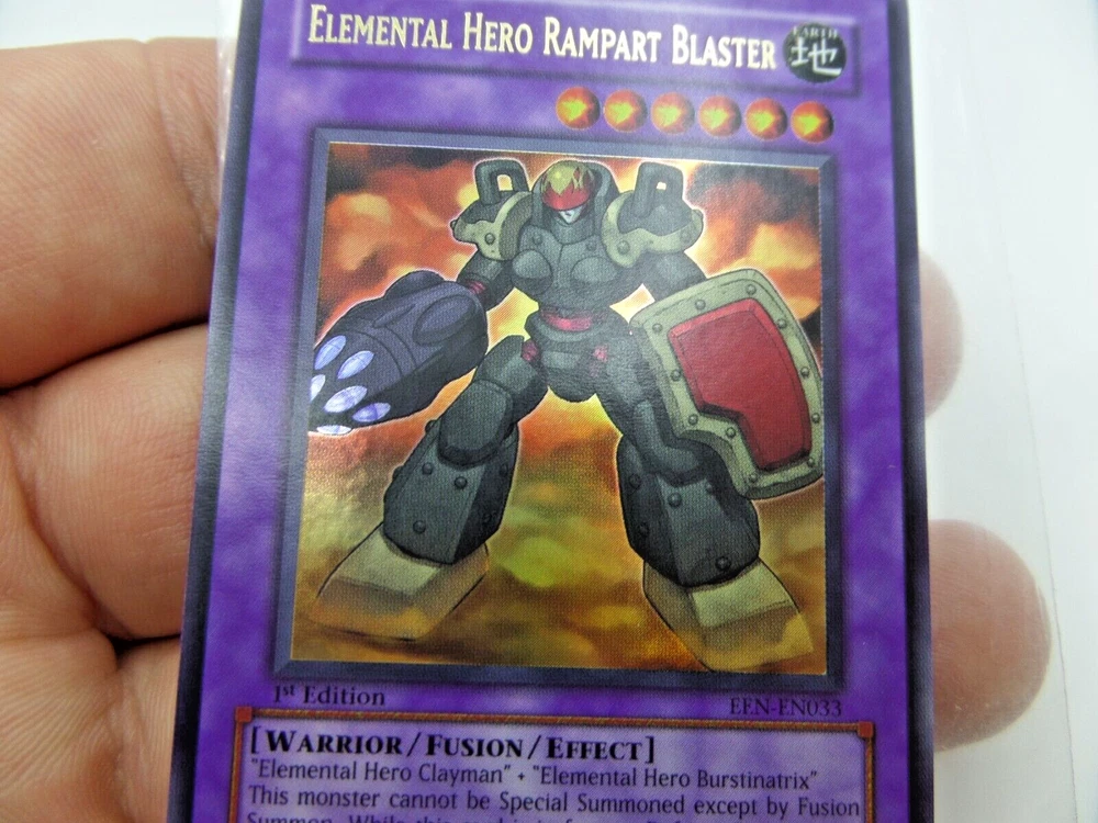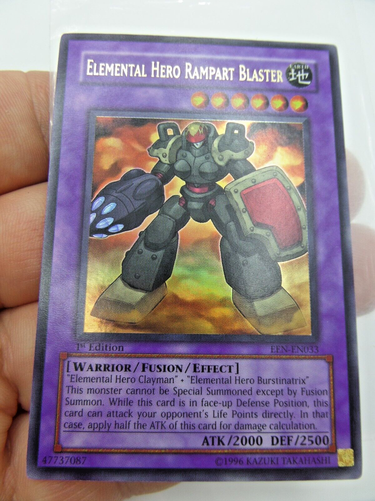 1 = Yugioh Elemental Hero Rampart Blaster 1st Edition EEN-EN033 Elemental Energy Card. (#71) **CARDS ARE NOT GRADED or THOROUGHLY CHECKED FOR SCRATCHES, SCUFFS, BENT ENDS, ETC - PLEASE SEE PICTURES** (We can take 1-5 pictures for you if needed, please just ask us through eBay messenger) Card looks like its in fairly good shape, but we are NOT card experts, So please check out the pictures on this card Yourself. 1st edition, 1996 Kazuki Takahashi/ Konami Trading Card Game. Card is in two sleeves. Came out of an Estate Sale from a collector - we will be posting more cards up as fast as we can. This card has scuffs, scratches, bent ends, other damage, etc. ***ALL CARDS ARE SOLD AS-IS WHERE IS, NO REFUNDS, NO RETURNS, NOT GRADED, COULD HAVE DAMAGE, YOU'RE TAKING FULL RISK.*** FREE USPS SHIPPING TO LOWER 48 STATES ONLY. Elemental Hero Rampart Blaster - Elemental Energy Product Details "E-Hero Burst Lady" + "E-Hero Clayman" This monster cannot be Special Summoned except by Fusion Summon. While this card is in face-up Defense Position, this card can attack your opponent's Life Points directly. In that case, apply half the ATK of this card for damage calculation. Number: EEN-EN033 Rarity: Ultra Rare Attribute Monster Type/Card Type: EARTH Warrior/Fusion/Effect Monster Level: 6 A / D: 2000 / 2500