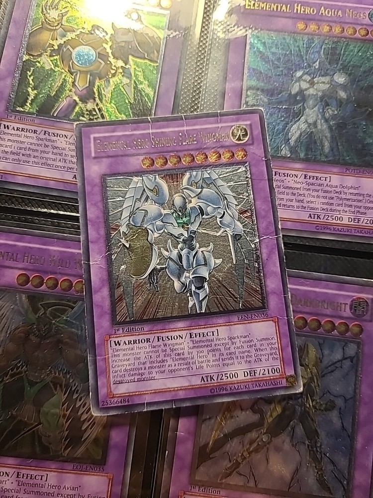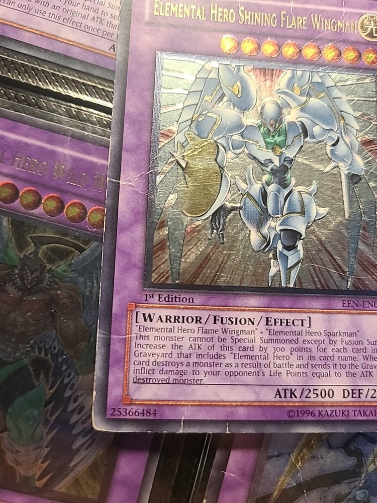 This rare and highly sought-after card is a must-have for any avid collector of Yu-Gi-Oh! TCG. With its stunning artwork, this 1st edition Elemental Hero Shining Flare Wingman EEN-EN036 Ultimate card in German is a beautiful addition to any collection. Featuring an iconic Angel creature type and autographed by 5ban Graphics, this card is a true gem. Made from high-quality aluminum with a foil finish, it exudes a vintage feel that is both timeless and valuable. Don't miss out on this opportunity to own a piece of history.