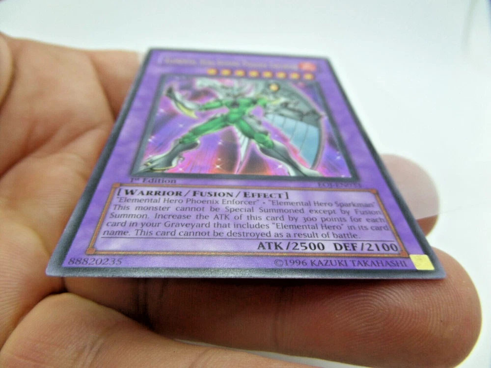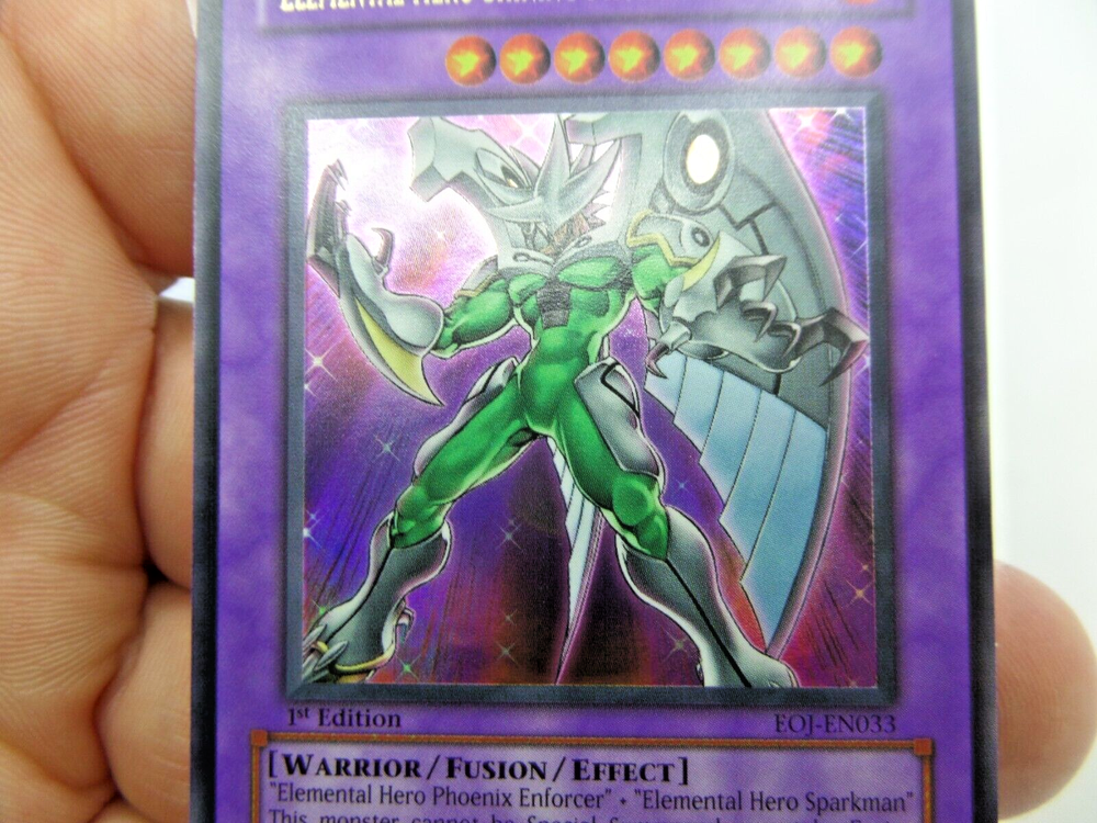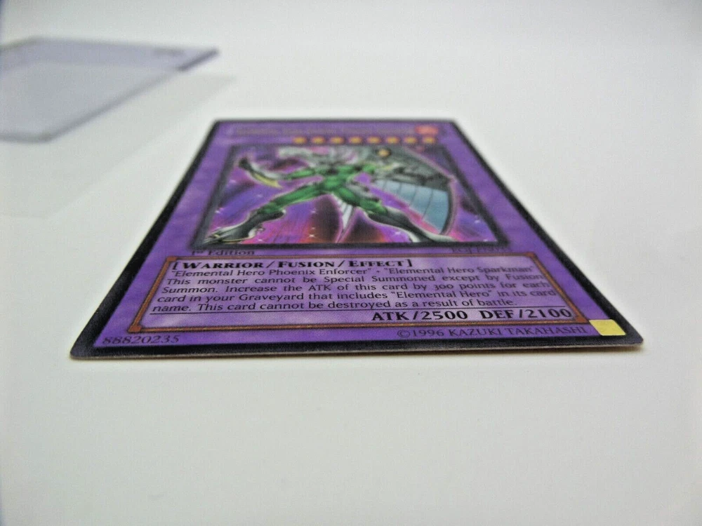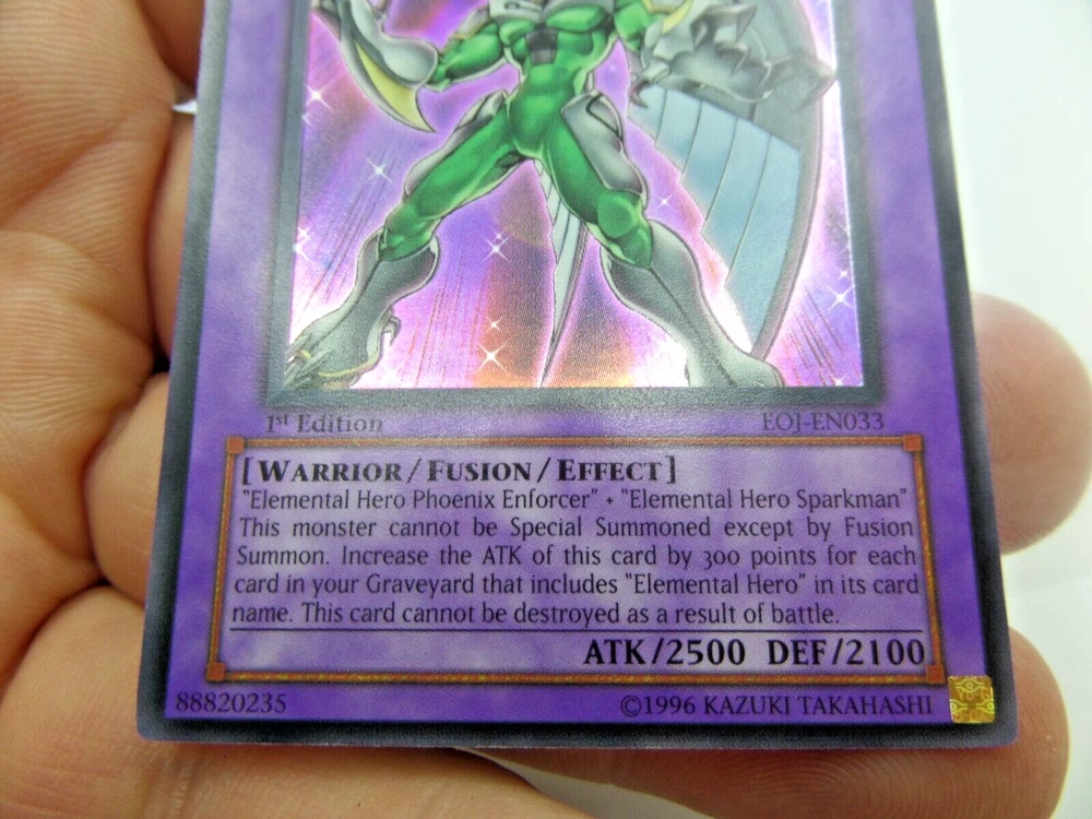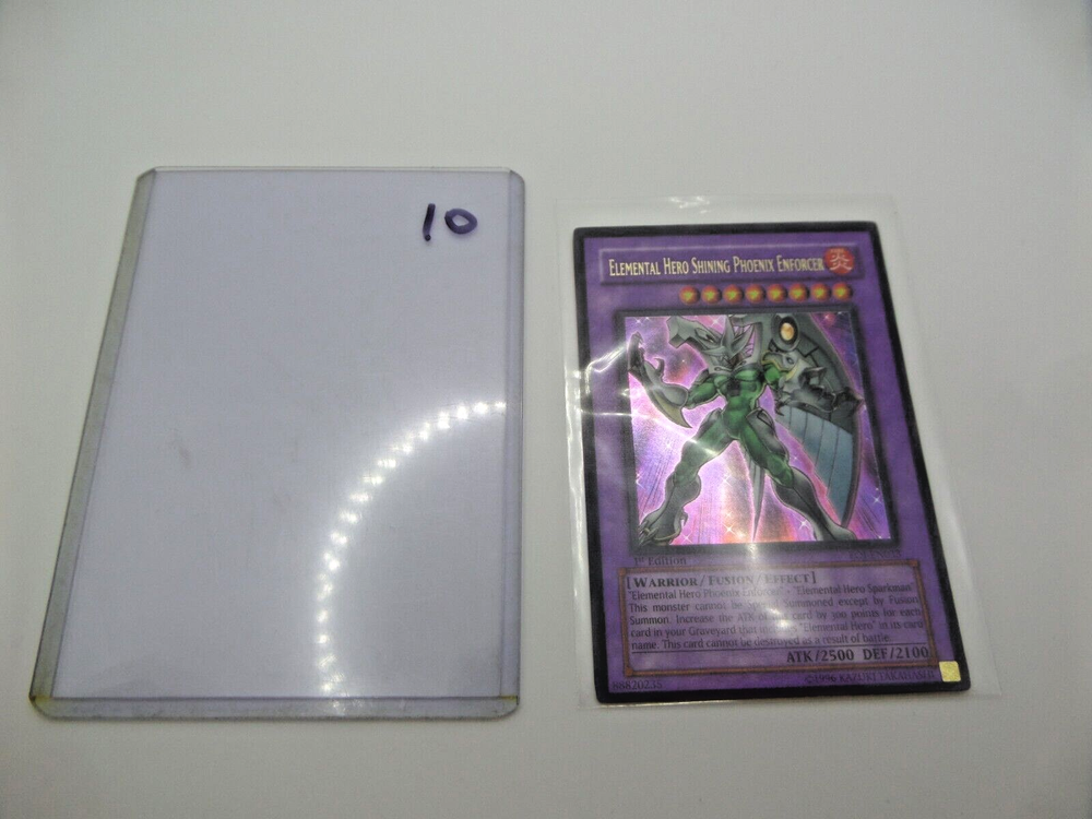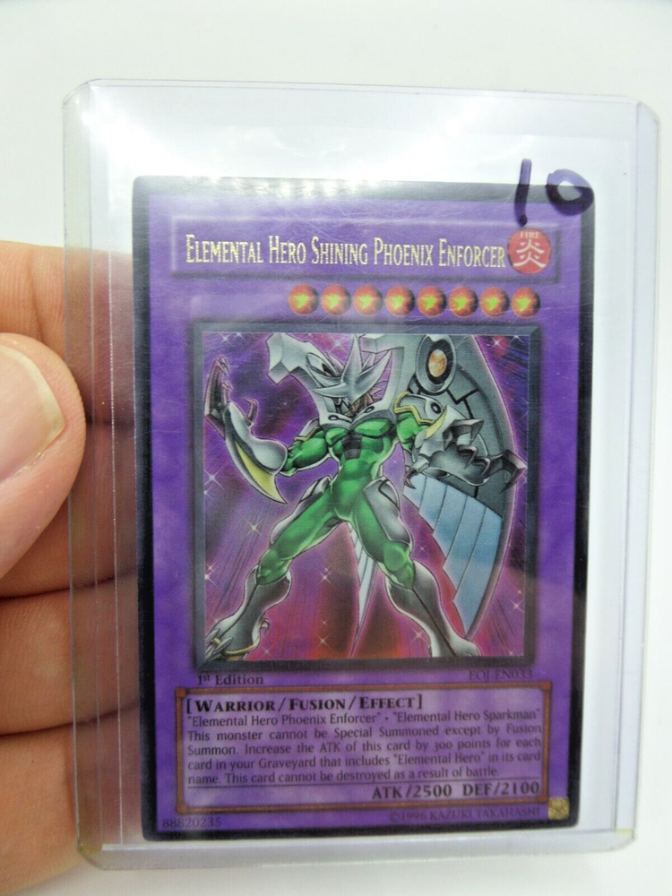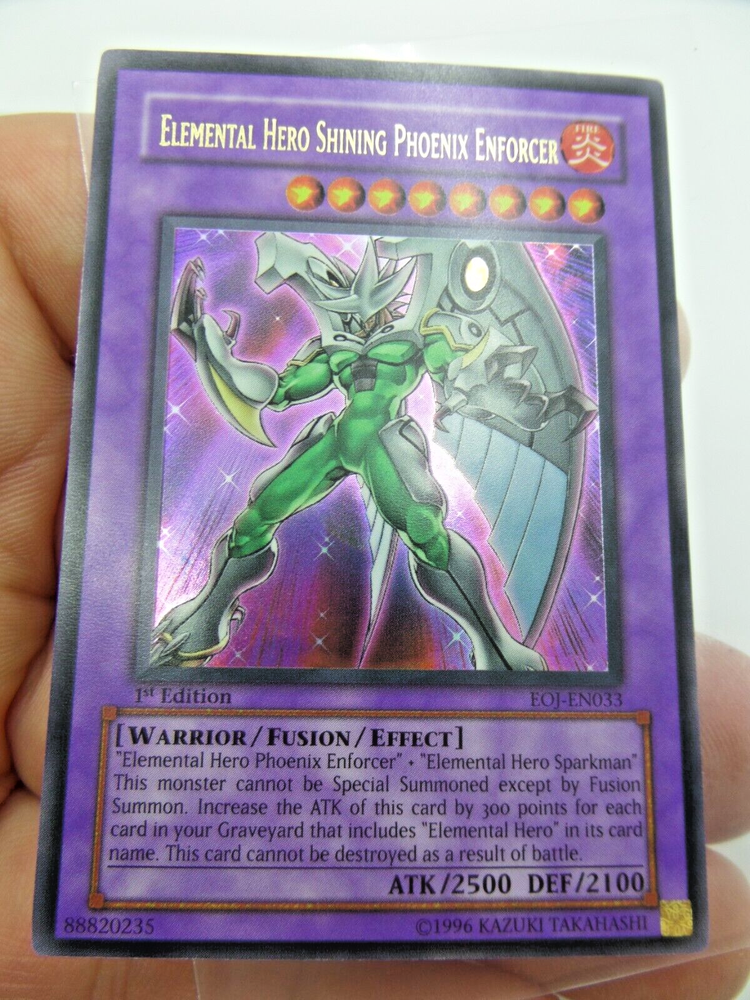 1 - Yugioh Elemental Hero Shining Phoenix Enforcer 1st Edition EOJ-EN033 Enemy of Justice Card. (#10) **CARDS ARE NOT GRADED or THOROUGHLY CHECKED FOR SCRATCHES, SCUFFS, BENT ENDS, ETC - PLEASE SEE PICTURES** (We can take 1-5 pictures for you if needed, please just ask us through eBay messenger) Card looks like its in fairly good shape, but we are NOT card experts, So please check out the pictures on this card Yourself. 1st edition, 1996 Kazuki Takahashi/ Konami Trading Card Game. Card is in two sleeves. Came out of an Estate Sale from a collector - we will be posting more cards up as fast as we can. This card has scuffs, scratches, bent ends, other damage, etc. ***ALL CARDS ARE SOLD AS-IS WHERE IS, NO REFUNDS, NO RETURNS, NOT GRADED, COULD HAVE DAMAGE, YOU'RE TAKING FULL RISK.*** Elemental Hero Shining Phoenix Enforcer - Enemy of Justice Product Details "Elemental HERO Phoenix Enforcer" + "Elemental HERO Sparkman" This card can only be Special summon by Fusion Summon. This card attack strength is increase by 300 for each monster with [E HERO] in their name in your graveyard. This card cannot be destroyed as a result of battle. Number: EOJ-EN033 Rarity: Ultra Rare Attribute Monster Type/Card Type: FIRE Warrior/Fusion/Effect Monster Level: 8 A / D: 2500 / 2100 -----> WE WILL BUBBLE WRAP THIS FOR SAFE ARRIVAL! <----- ____________________ - Shipping is based on your location, and if it's over $150.00 there will be a signature required, and an signature fee is added to the shipping cost, this includes insurance on the package if over $100.00. - All package(s) are measured, weighed and put in correctly in eBay for actual shipping costs - these are what they charge, not us (plus eBay takes 2% of shipping costs from us) . Questions? Email Us! Thank you for visiting Surf City Picker eBay Store. ____________ We do offer returns on this item IF something isn't working like from factory on MOST ITEMS WE SELL. This is from 14-Days from time received/delivered (NOT purchase date) . Buyer must pay shipping costs to return item as stated per eBay listing rules. We Do Put Warranty Stickers on Certain Items and Custom Mark Them to Ensure No Switch-A-Roos.