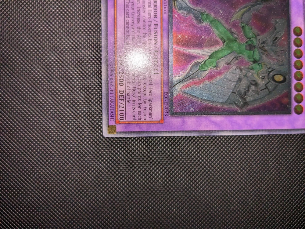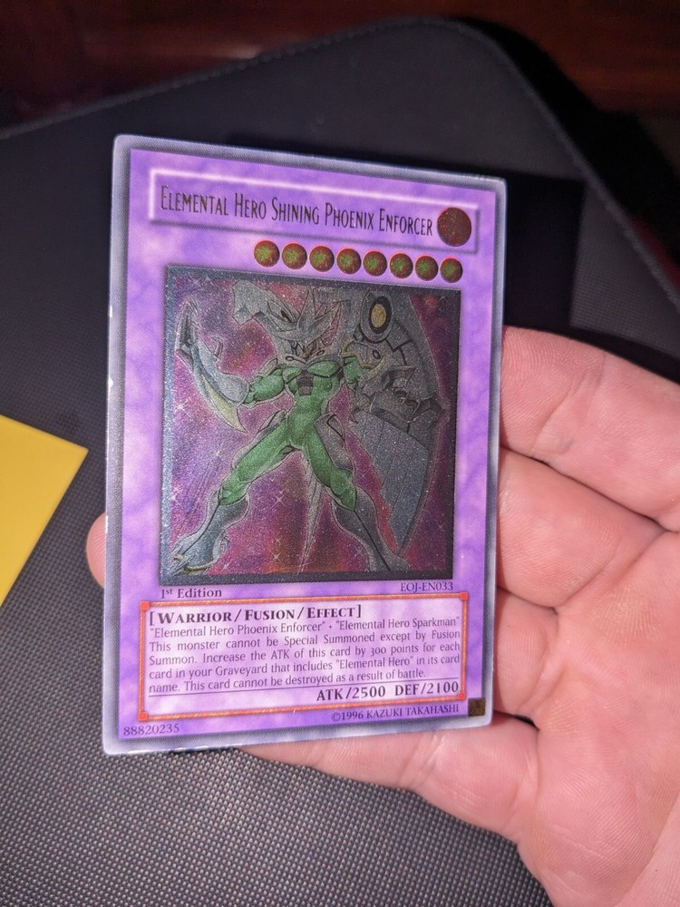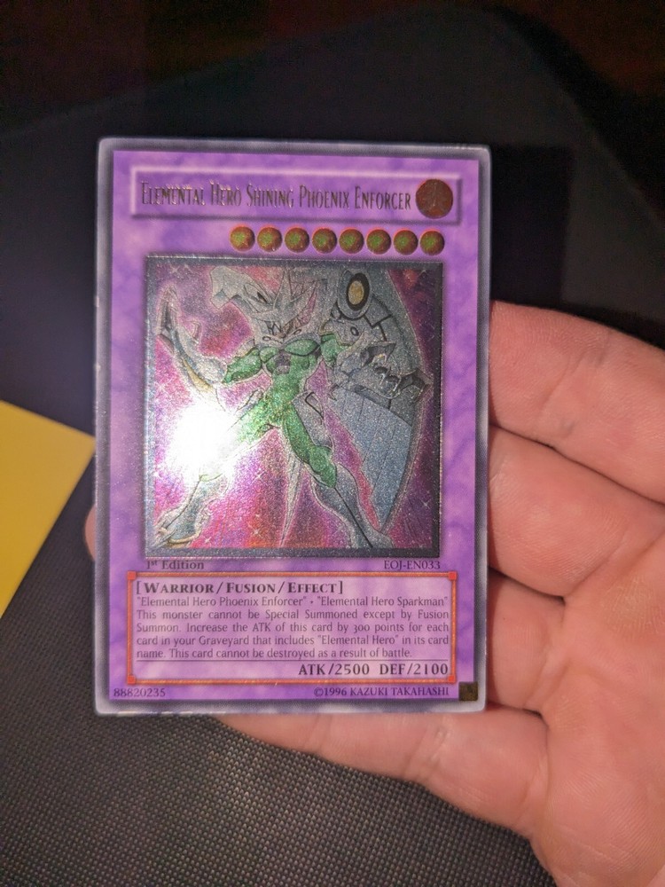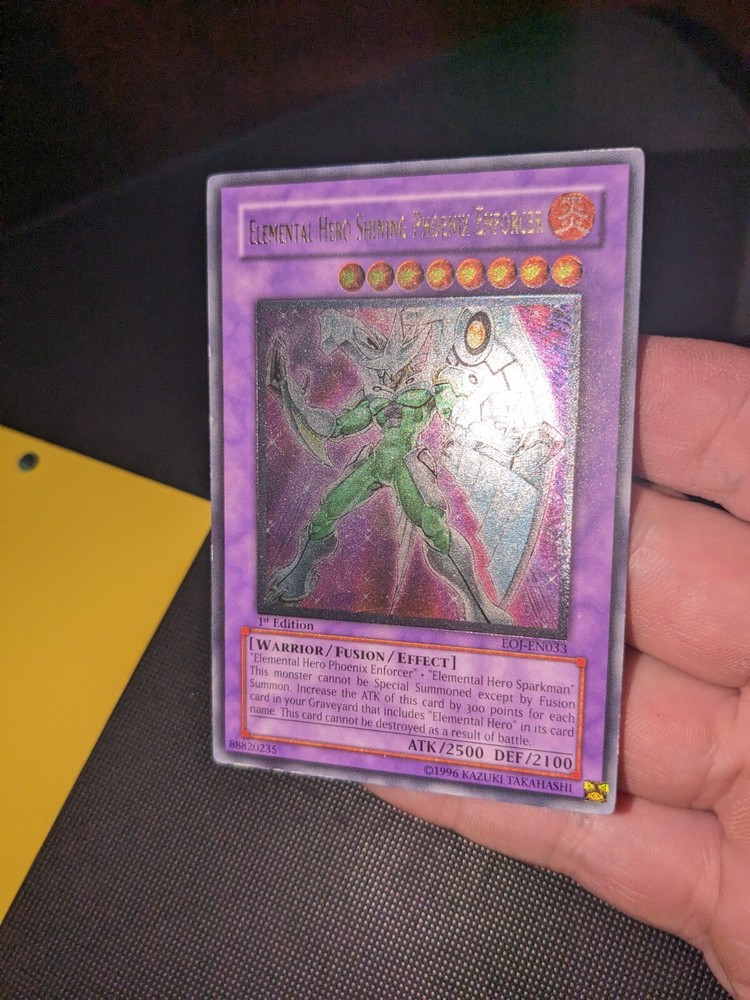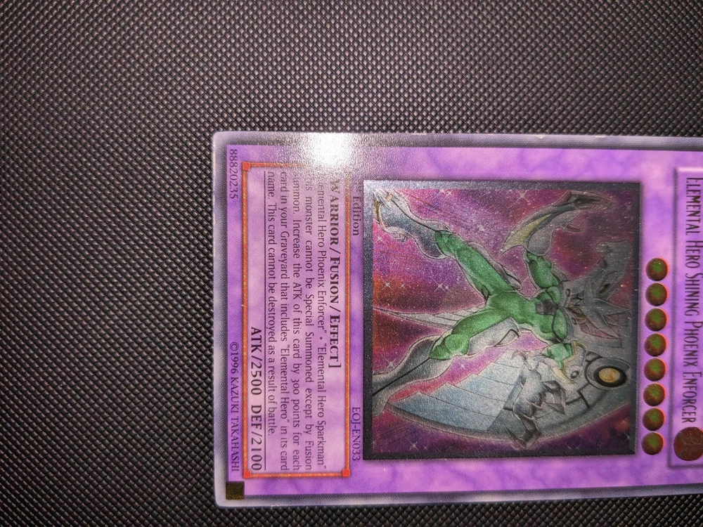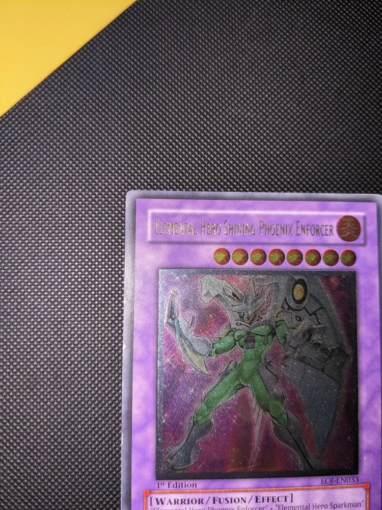 This Yu-Gi-Oh! trading card features the Elemental Hero Shining Phoenix Enforcer, a Fusion-type creature from the Enemy of Justice set. The card is a highly sought-after Ultimate Rare, and is a 1st Edition release. The card is in excellent condition, with only minor signs of wear that do not affect its playability. With its unique abilities and rarity, this card is a must-have for any serious Yu-Gi-Oh! collector or player. Add it to your deck or collection today!