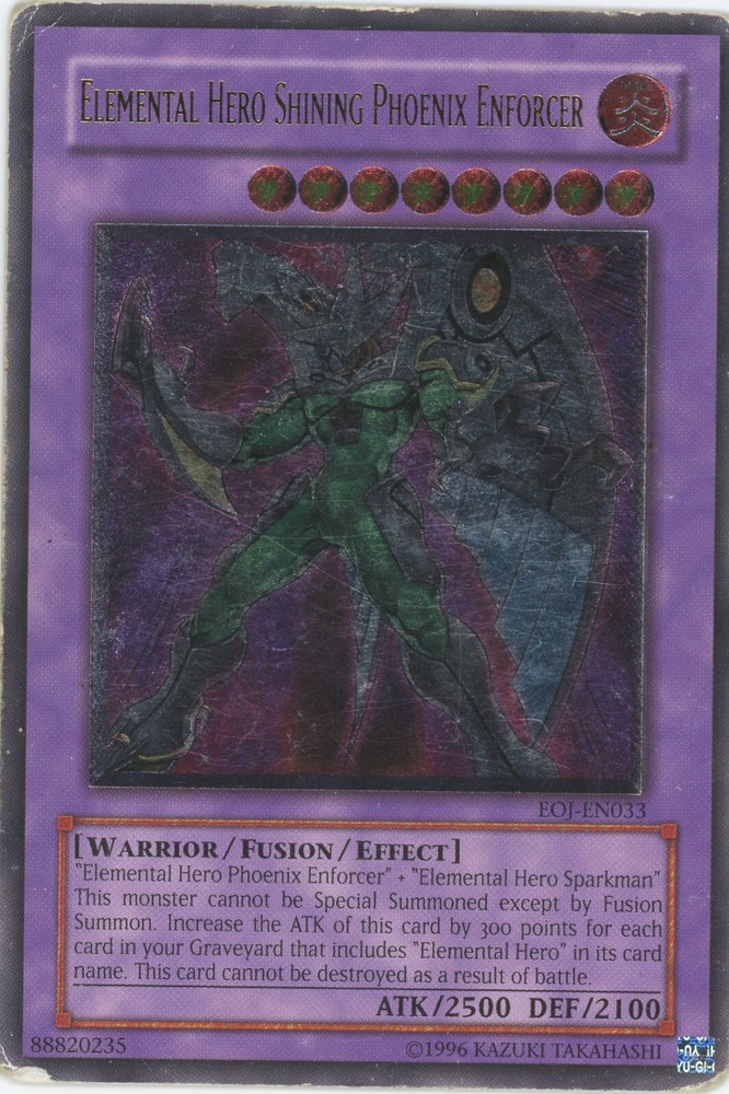 Yugioh Elemental Hero Shining Phoenix Enforcer EOJ-EN033 Ultimate Rare MP You can find more Yu-Gi-Oh cards of all value and rarity in our other listings All cards are in excellent condition unless stated otherwise and the photos are of cards we own but may not be the exact card you receive due to the quantities listed.