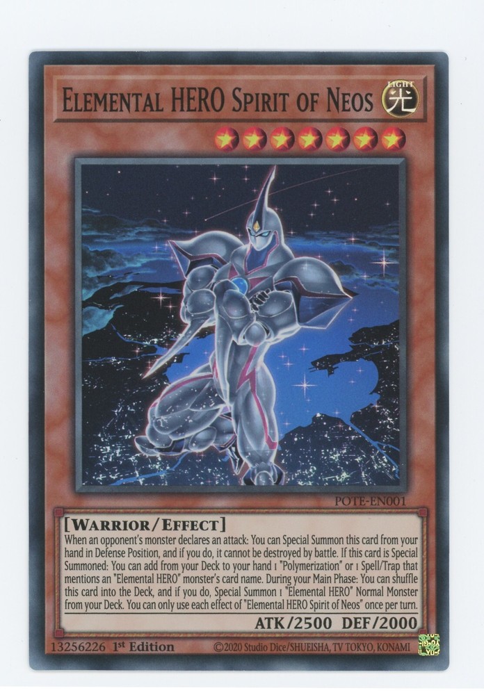 Yugioh Elemental Hero Spirit Of Neos POTE-EN001 Super 1st Edition NM You can find more Yu-Gi-Oh cards of all value and rarity in our other listings All cards are in excellent condition unless stated otherwise and the photos are of cards we own but may not be the exact card you receive due to the quantities listed.