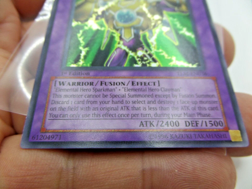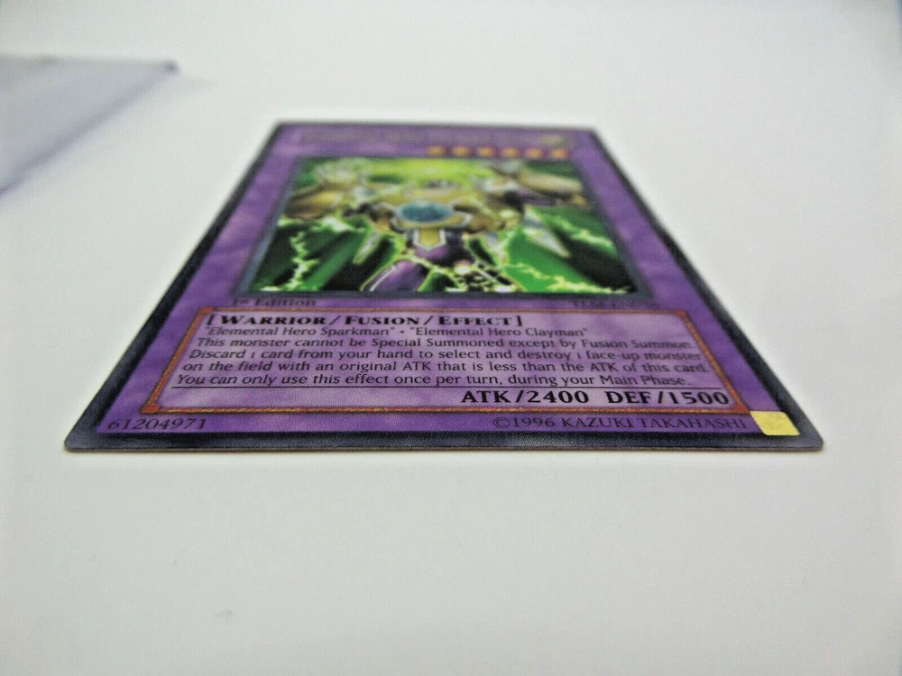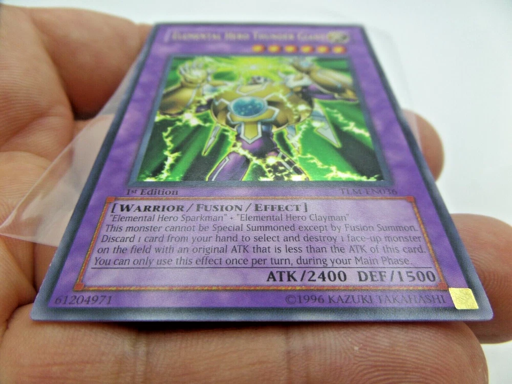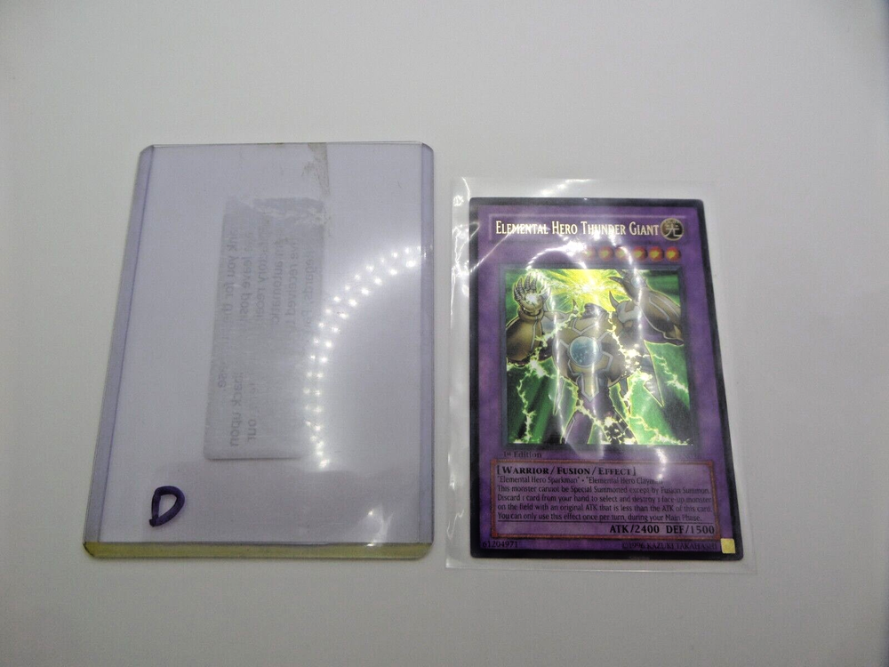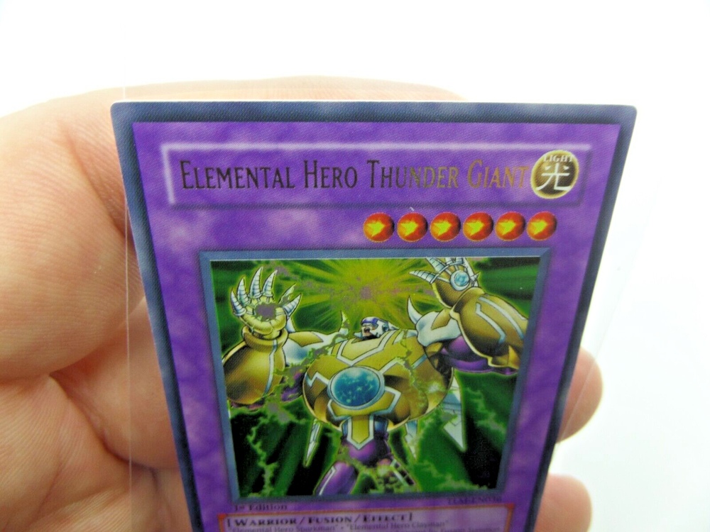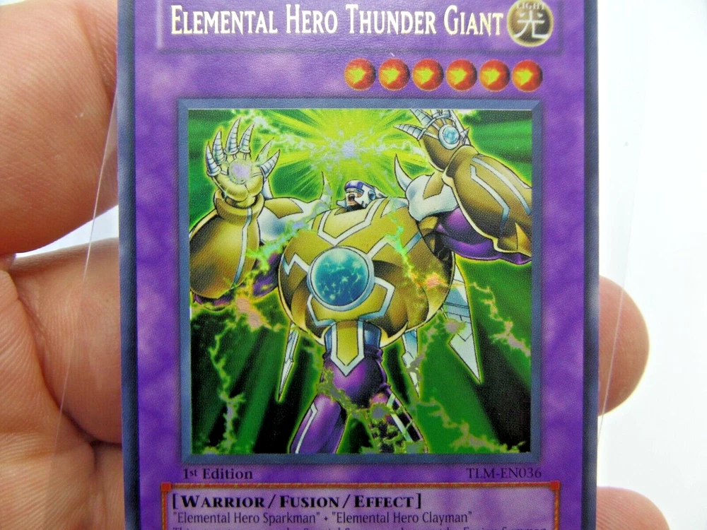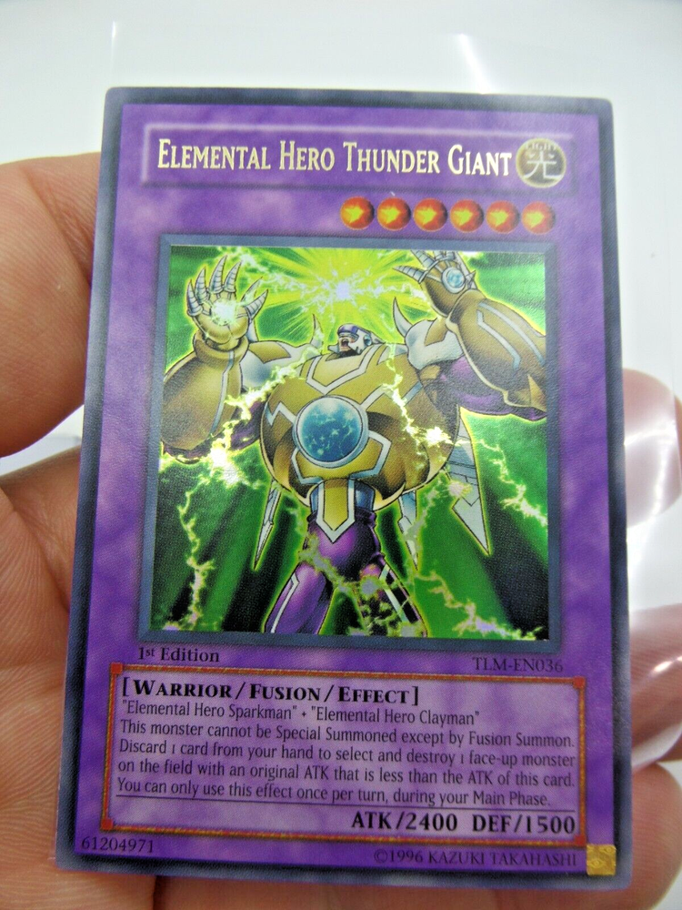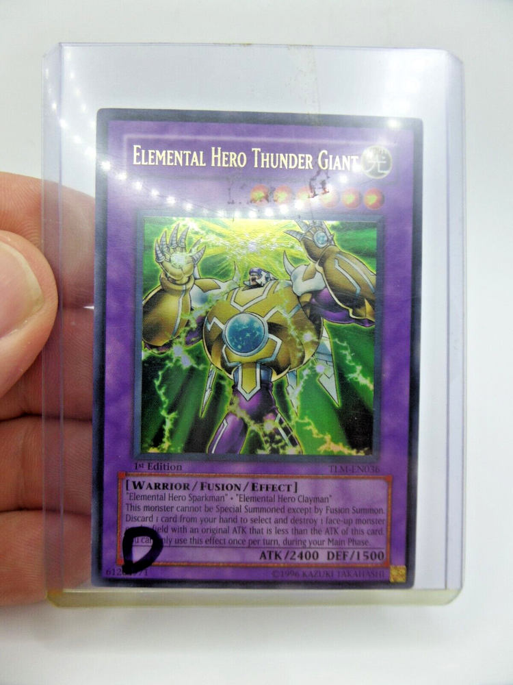 1 = Yugioh Elemental Hero Thunder Giant 1st Edition TLM-EN036 The Lost Millennium Card. (#D) **CARDS ARE NOT GRADED or THOROUGHLY CHECKED FOR SCRATCHES, SCUFFS, BENT ENDS, ETC - PLEASE SEE PICTURES** (We can take 1-5 pictures for you if needed, please just ask us through eBay messenger) Card looks like its in fairly good shape, but we are NOT card experts, So please check out the pictures on this card Yourself. 1st edition, 1996 Kazuki Takahashi/ Konami Trading Card Game. Card is in two sleeves. Came out of an Estate Sale from a collector - we will be posting more cards up as fast as we can. This card has scuffs, scratches, bent ends, other damage, etc. ***ALL CARDS ARE SOLD AS-IS WHERE IS, NO REFUNDS, NO RETURNS, NOT GRADED, COULD HAVE DAMAGE, YOU'RE TAKING FULL RISK.*** FREE USPS SHIPPING TO LOWER 48 STATES ONLY. Elemental HERO Thunder Giant - The Lost Millennium (TLM) Product Details [E-Hero Sparkman] + [E-Hero Clayman] This card can only be special summoned by Fusion Summon. Discard a card from your hand, destroy a face-up monster with attack strength lower than this card. This effect can only be activate once per turn during your main phases. Number: TLM-EN036 Rarity: Ultra Rare Attribute Monster Type/Card Type: LIGHT Warrior/Fusion Monster Level: 6 A / D: 2400 / 1500