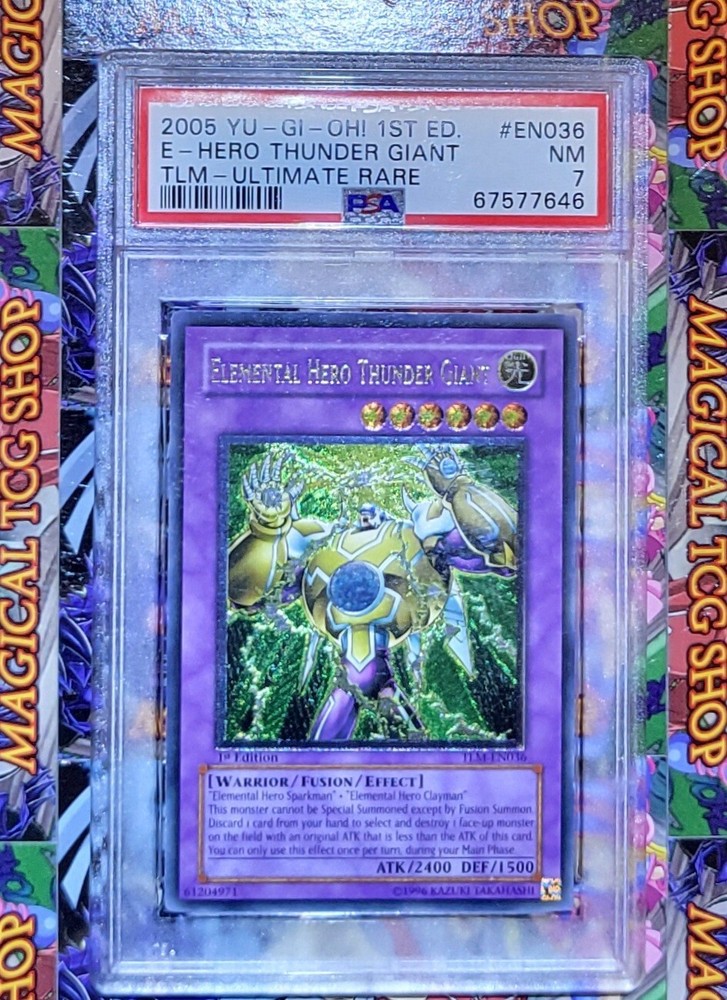 Thank you for taking your valuable time to read my description. You will receive the exact genuine and authentic Yu-Gi-Oh card that you see in the photos for this listing. You are purchasing a 1st Edition Ultimate Rare Elemental Hero Thunder Giant TLM-EN036 from The Lost Millennium set that was released in June of 2005 by Konami. This card was professionally graded by PSA as Near Mint condition. Please refer to the photos for the condition of the card. If you require additional photos, please send me a message and I will provide you with the photos you need. Quality Shipping with maximum protection and it is free! Your order is very important to me, I package each order as if I were going to receive it myself and I know exactly how it feels to receive a damaged item (it is very disappointing). Your card will be handled with extreme care and delicacy. I make it a priority to provide the absolute best protection for your purchase. Your card will be inserted into a brand new plastic card sleeve, placed in a new hard plastic top loader, sealed inside of a new plastic team bag, properly set between 2 pieces of hand cut cardboard fit to match the top loader, wrapped in a layer of bubble wrap and mailed in a bubble padded mailer to ensure a safe delivery to your home. Same day Handling! Your order will ship the same business day that you place the order for orders placed before 5:00 PM (Eastern Standard Time) Mon-Fri. Your order will be shipped USPS 1st Class and tracking information is provided with your purchase. If you have any questions, send me a message and I will respond promptly. I appreciate your time, Thank you.