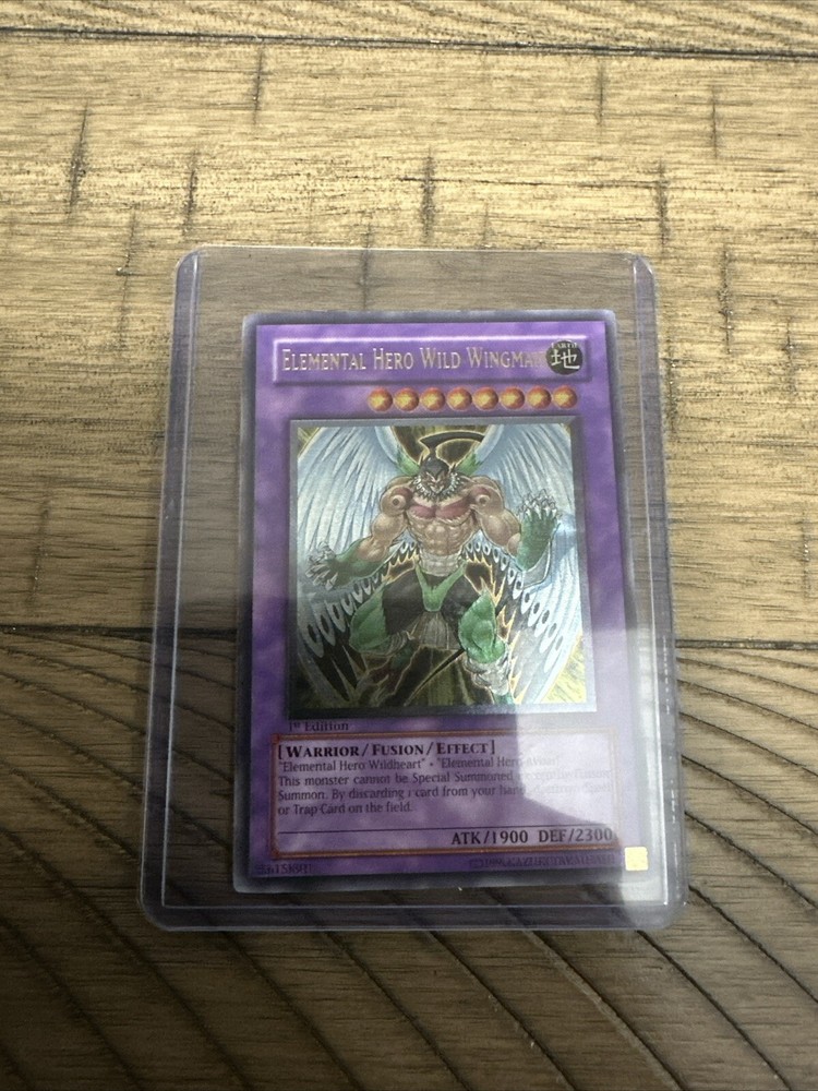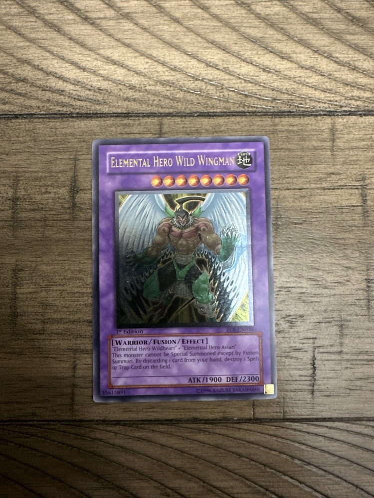 The "Yugioh Elemental Hero Wild Wingman" card is a Super Rare 1st Edition card from the "Enemy of Justice" set in the Yu-Gi-Oh! trading card game. This card features the Elemental Hero Wild Wingman character, a Fusion Warrior Effect monster with Earth attribute. Manufactured by Konami. Near Mint