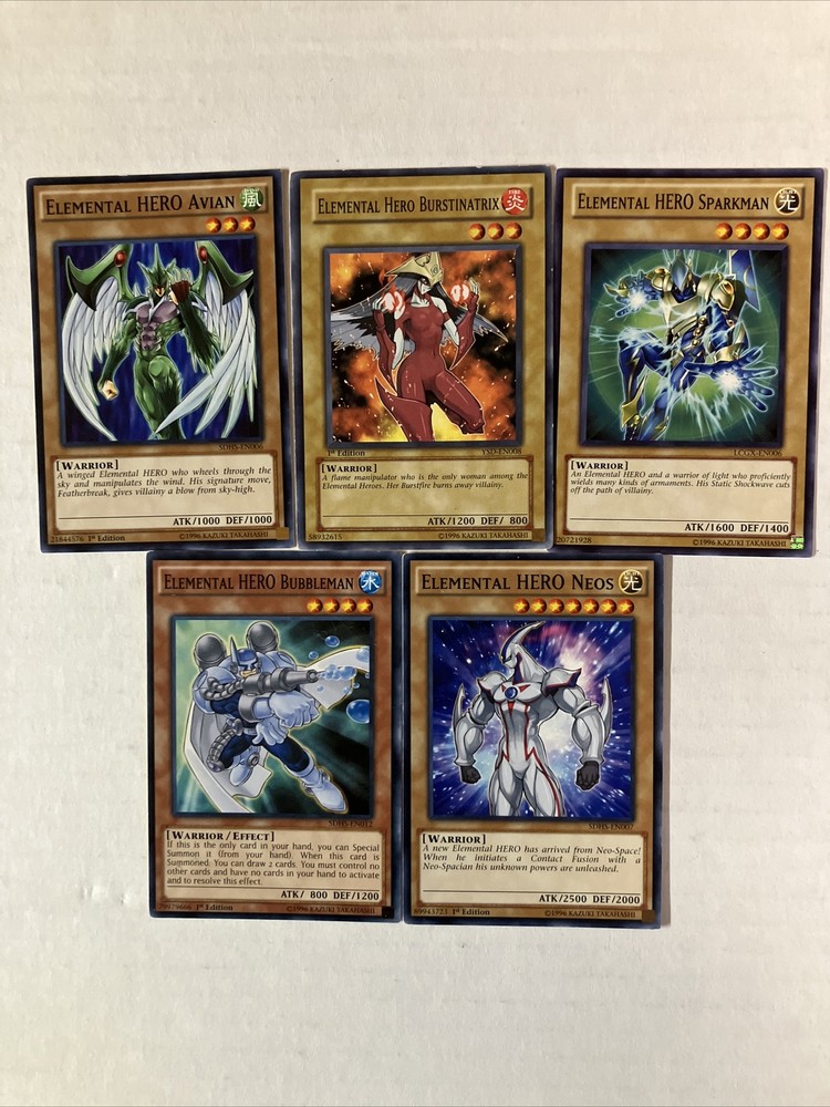 Yugioh Elemental hero Anime Collection. You will receive the 5x hero cards in the same artwork as the ones in the photo. All cards are Near Mint/Light Play. Cards will be mixed set and mixed edition....