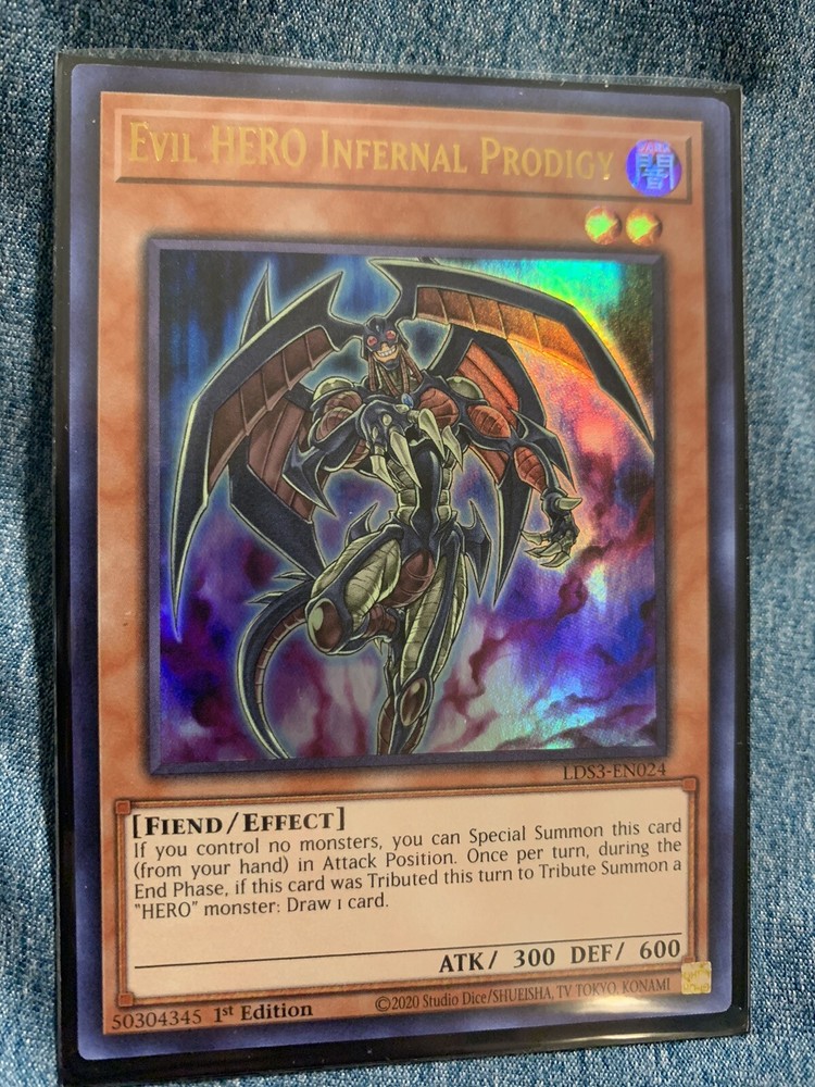 This Yu-Gi-Oh! TCG card features the Fiend and Effect Monster Type, with a card name of Evil Hero Infernal Prodigy. It is a 1st Edition Ultra Rare card from the Legendary Duelists: Season 3 set, with a foil finish and card number LDS3-EN024. The card is in English language and manufactured by Konami. The card is perfect for fans of the Yu-Gi-Oh! series, specifically the E. HERO Support. It is suitable for ages 6 and up and is a great addition to any CCG Individual Cards collection. Get your hands on this Dark-colored card without worrying about its condition.