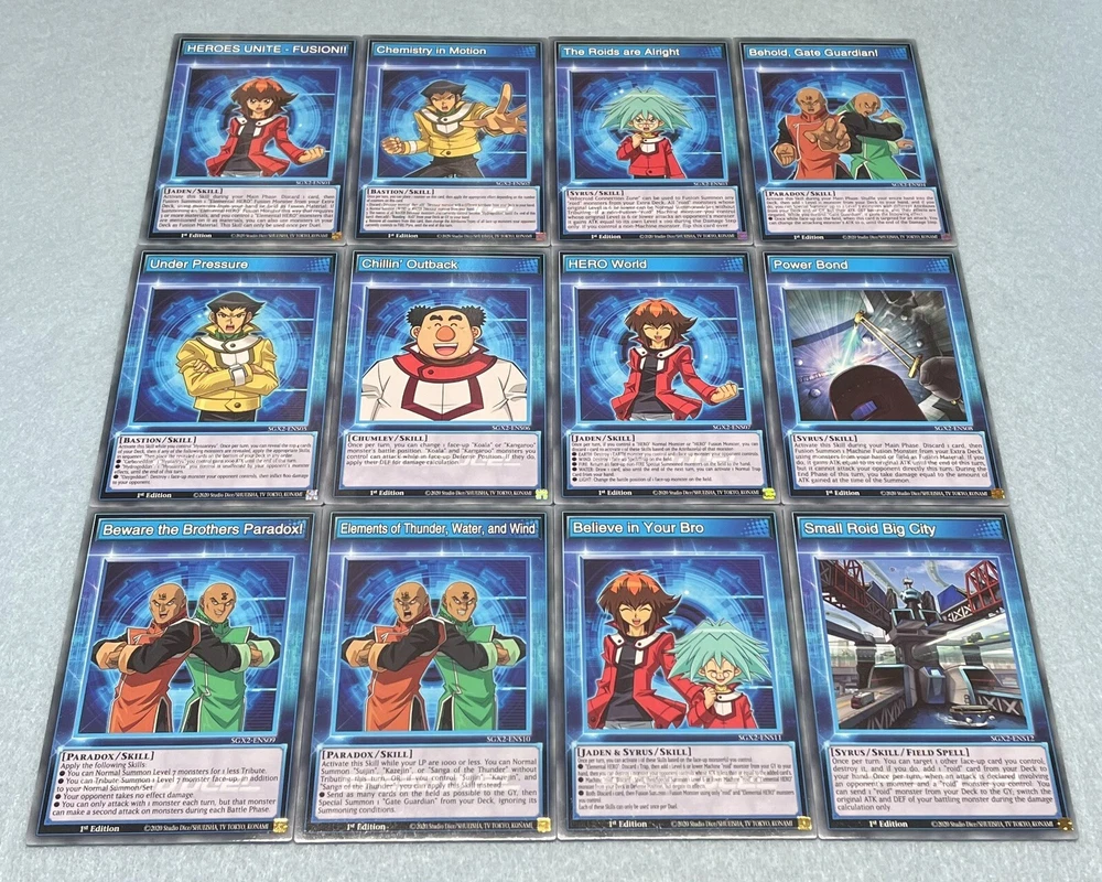 Listing includes the following: -One 81 card deck, featuring the most iconic cards used by Jaden Yuki in Yu-Gi-Oh GX -1 secret rare holographic card (listed below) -20 random additional Yu-Gi-Oh cards -12 speed duel skill cards for use in the speed duel format (listed below) -One random official Konami Yu-Gi-Oh Dice All cards are Speed Duel edition, and can be used in any Yu-Gi-Oh play format (including non-Speed Duel formats). You will receive all of the cards listed. Secret Rare Holographic Cards (1): 1x Elemental HERO Tempest Monster (33): 3x Elemental HERO Avian 3x Elemental HERO Sparkman 3x Elemental HERO Bubbleman 3x Elemental HERO Burstinatrix 3x Elemental HERO Clayman 3x Elemental HERO Blazeman 3x Elemental HERO Wildheart 3x Elemental HERO Bladedge 3x Winged Kuriboh 3x Dark Catapulter 3x Goddess with the Third Eye Spell (21): 3x Polymerization 3x A Hero Lives 3x Fifth Hope 3x H - Heated Heart 3x R - Righteous Justice 3x Sabatiel - The Philosopher’s Stone 3x Skyscraper 2 - Hero City Trap (9): 3x Hero Signal 3x Hero Counterattack 3x Hero Ring Extra Deck (18): 3x Elemental HERO Tempest 3x Elemental HERO Necroid Shaman 3x Elemental HERO Mariner 3x Elemental HERO Electrum 3x Elemental HERO Wild Wingman 3x Elemental HERO Nova Master Skill Cards (12): 1x HEROES UNITE - FUSION!! 1x Chemistry in Motion 1x The Roids are Alright 1x Behold, Gate Guardian! 1x Under Pressure 1x Chillin' Outback 1x HERO World 1x Power Bond (Skill Card) 1x Beware the Brothers Paradox! 1x Elements of Thunder, Water, and Wind 1x Believe in your Bro 1x Small Roid Big City All cards are in near-mint condition