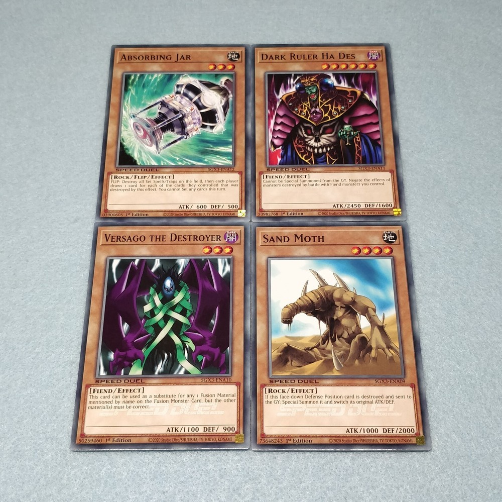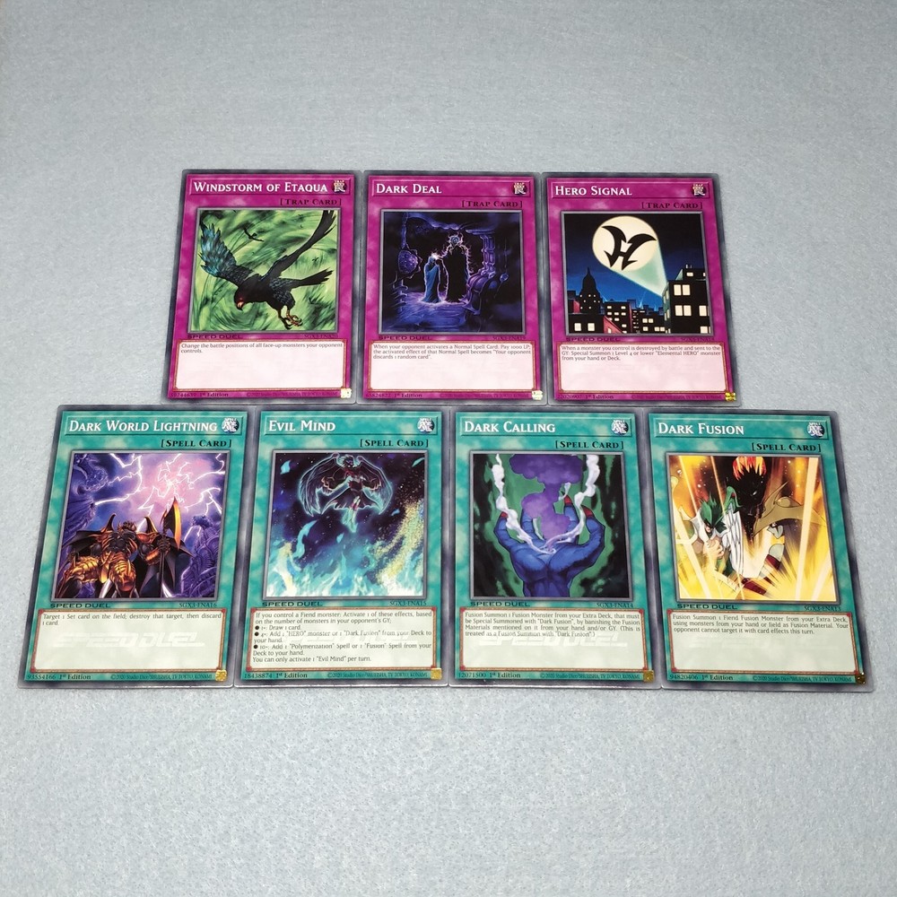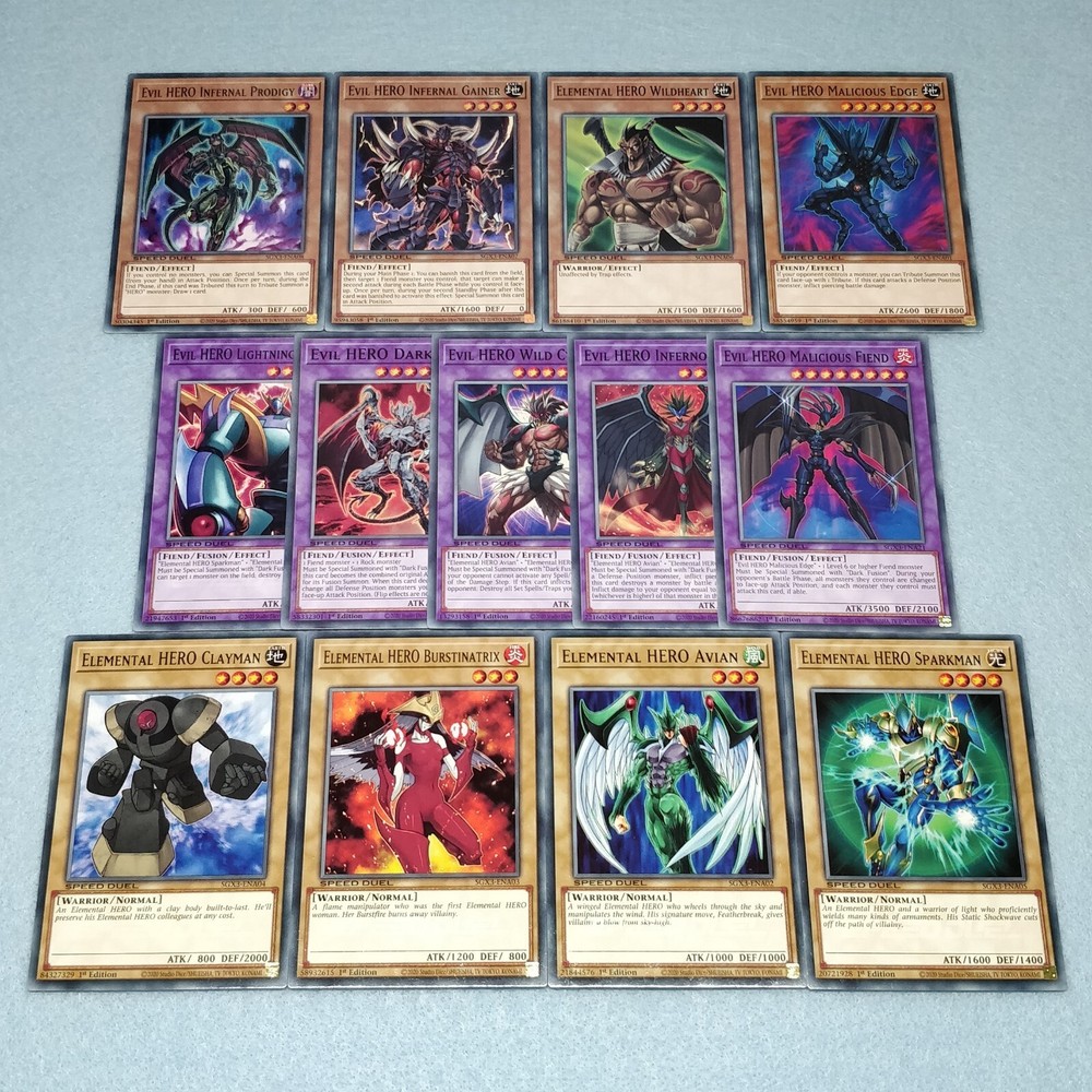 You will receive all of the cards listed. All cards are Speed Duel edition, and can be used in any Yu-Gi-Oh play format (including non-Speed Duel formats). All cards are in near-mint condition Monster (18): 1x Elemental HERO Avian 1x Elemental HERO Burstinatrix 1x Elemental HERO Clayman 1x Elemental HERO Sparkman 1x Elemental HERO Wildheart 1x Evil HERO Infernal Prodigy 1x Evil HERO Infernal Gainer 1x Evil HERO Malicious Edge 3x Dark Ruler Ha Des 1x Versago the Destroyer 3x Absorbing Jar 3x Sand Moth Spell (12): 3x Dark World Lightning 3x Dark Fusion 3x Dark Calling 3x Evil Mind Trap (9): 3x Windstorm of Etaqua 3x Hero Signal 3x Dark Deal Extra Deck (5): 1x Evil HERO Malicious Fiend 1x Evil HERO Dark Gaia 1x Evil HERO Lightning Golem 1x Evil HERO Wild Cyclone 1x Evil HERO Inferno Wing