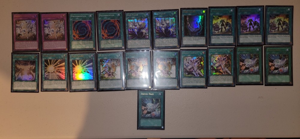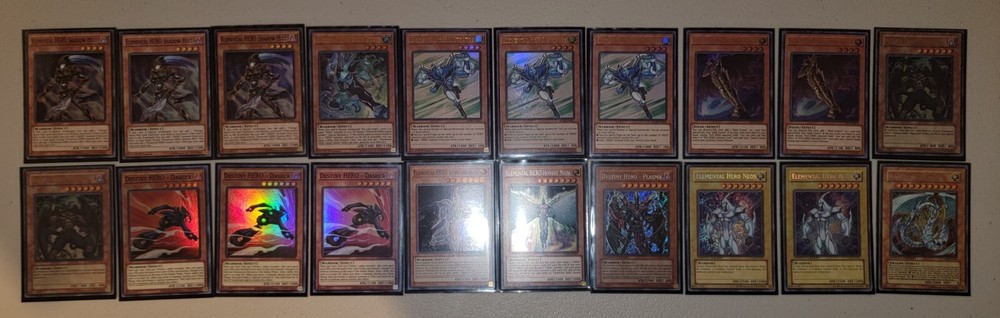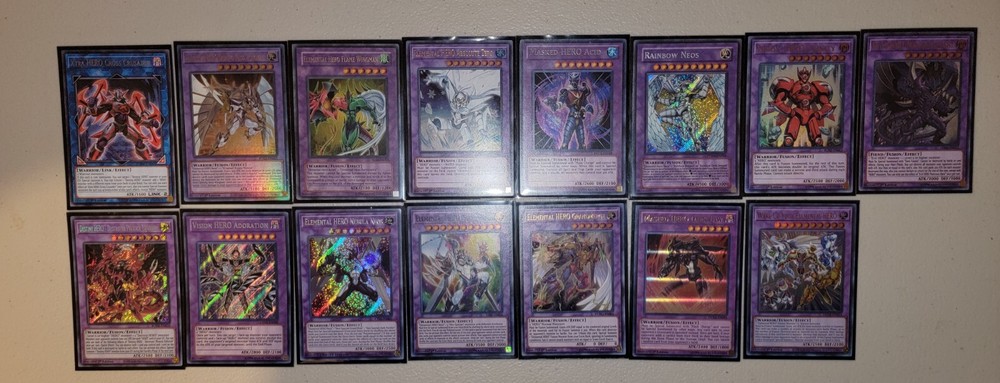 Yugioh HERO Deck ready to Play. All cards in mint condition The Ultimate HERO Deck 40 Cards Monster Cards: 1. Elemental HERO Shadow Mist 2. Elemental HERO Shadow Mist 3. Elemental HERO Shadow Mist 4. Elemental HERO Liquid Soldier 5. Elemental HERO Stratos 6. Elemental HERO Stratos 7. Elemental HERO Stratos 8. Evil HERO Adusted Gold 9. Evil HERO Adusted Gold 10. Destiny HERO - Malicious 11. Destiny HERO - Malicious 12. Destiny HERO - Dasher 13. Destiny HERO - Dasher 14. Destiny HERO - Dasher 15. Destiny HERO - Plasma 16. Elemental HERO Spirit of Neos 17. Elemental HERO Honest Neos 18. Elemental HERO Neos 19. Elemental HERO Neos 20. Rainbow Dragon Spell Cards: 1. Polymerization 2. Polymerization 3. Dark Calling 4. Fusion Destiny 5. Neos Fusion 6. Neos Fusion 7. Instant Contact 8. Instant Contact 9. Mask Change 10. Mask Change 11. A Hero Lives 12. A Hero Lives 13. A Hero Lives 14. EN Shuffle 15. EN Shuffle 16. EN Shuffle 17. Destiny Draw 18. Destiny Draw 19. Destiny Draw Trap Cards: 1. Favorite Contact 2. Favorite Contact Extra Deck: 1. Elemental HERO Absolute Zero 2. Elemental HERO Flame Wingman 3. Elemental HERO Shining Neos Wingman 4. Evil HERO Malicious Bane 5. Destiny HERO - Destroyer Phoenix Enforcer 6. Masked HERO Acid 7. Masked HERO Dark Law 8. Vision HERO Adoration 9. Vision HERO Trinity 10. Xtra HERO Cross Crusader 11. Elemental HERO Grandmerge 12. Elemental HERO Cosmo Neos 13. Elemental HERO Nebula Neos 14. Wake Up Your Elemental HERO 15. Rainbow Neos